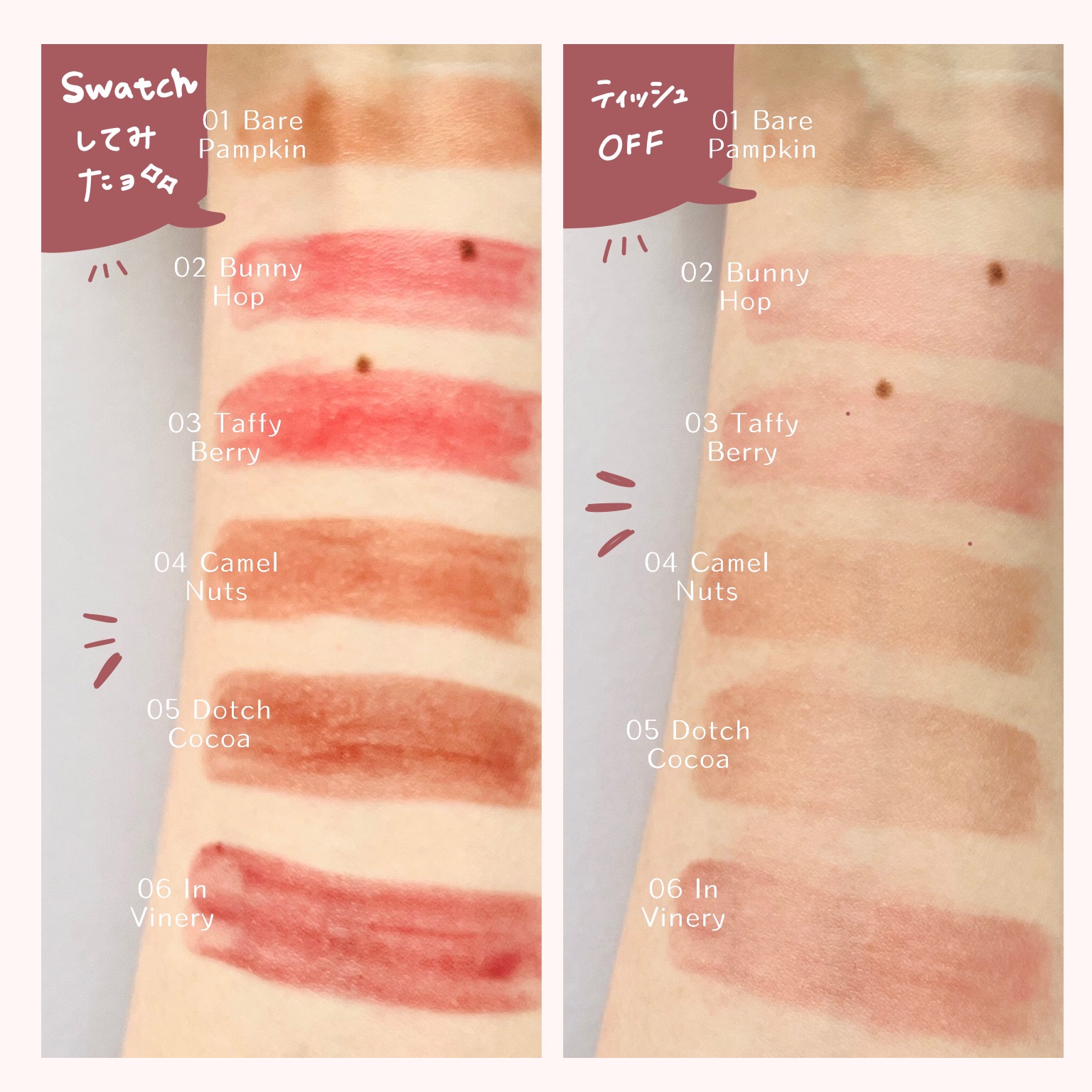 - <01 ベアパンプキン(BARE PUMPKIN)> オクチルドデカノール、ペンタイソステアリン酸ジペンタエリスリチル、ジ安息香酸PG、ヘキサ脂肪酸(C5-9)ジペンタエリスリチルエステルズ、トリ(カプリル酸/カプリン酸)グリセリル、合成ワックス、水添ポリイソブテン、ダイマージリノール酸(フィトステリル/イソステアリル/セチル/ステアリル/ベヘニル)、パラフィン、グリセリン、キャンデリラロウ、フェニルプロピルジメチルシロキシケイ酸、合成フルオロフロゴパイト、水添野菜油、リンゴ酸ジイソステアリル、酸化チタン、イソステアリン酸ソルビタン、ラウリルPEG-9ポリジメチルシロキシエチルジメチコン、アルガニアスピノサ核油、トリ酢酸テトラステアリン酸スクロース、ビニルジメチコン、(セバシン酸/イソパルミチン酸)ジグリセリル、ポリヒドロキシステアリン酸、ジステアルジモニウムヘクトライト、(エチレン/プロピレン)コポリマー、トリイソステアリン酸ポリグリセリル-2、レシチン、マイクロクリスタリンワックス、ポリエチレン、水、パルミチン酸エチルヘキシル、ミリスチン酸イソプロピル、イソステアリン酸、酸化鉄、ステアリン酸ポリグリセリル-10、炭酸プロピレン、ポリリシノレイン酸ポリグリセリル-3、黄5、黄4、1,2-ヘキサンジオール、赤202、ジイソステアリン酸ポリグリセリル-2、赤104(1)、青1、トコフェロール、ハス花エキス、ニンファエアアルバ花エキス、ヤマザクラ花エキス、ハイブリッドローズ花エキス、ソルビン酸K <02 バニーホップ(BUNNY HOP)> オクチルドデカノール、ペンタイソステアリン酸ジペンタエリスリチル、ジ安息香酸PG、ヘキサ脂肪酸(C5-9)ジペンタエリスリチルエステルズ、トリ(カプリル酸/カプリン酸)グリセリル、合成ワックス、水添ポリイソブテン、ダイマージリノール酸(フィトステリル/イソステアリル/セチル/ステアリル/ベヘニル)、パラフィン、グリセリン、リンゴ酸ジイソステアリル、キャンデリラロウ、フェニルプロピルジメチルシロキシケイ酸、合成フルオロフロゴパイト、酸化チタン、水添野菜油、イソステアリン酸ソルビタン、ラウリルPEG-9ポリジメチルシロキシエチルジメチコン、アルガニアスピノサ核油、トリ酢酸テトラステアリン酸スクロース、ビニルジメチコン、(セバシン酸/イソパルミチン酸)ジグリセリル、ポリヒドロキシステアリン酸、ジステアルジモニウムヘクトライト、(エチレン/プロピレン)コポリマー、トリイソステアリン酸ポリグリセリル-2、マイクロクリスタリンワックス、レシチン、ポリエチレン、水、パルミチン酸エチルヘキシル、ミリスチン酸イソプロピル、イソステアリン酸、ステアリン酸ポリグリセリル-10、酸化鉄、炭酸プロピレン、黄4、ポリリシノレイン酸ポリグリセリル-3、赤227、1,2-ヘキサンジオール、赤202、黄5、ジイソステアリン酸ポリグリセリル-2、青1、トコフェロール、ハス花エキス、ニンファエアアルバ花エキス、ヤマザクラ花エキス、ハイブリッドローズ花エキス、ソルビン酸K <03 タフィーベリー(TAFFY BERRY)> オクチルドデカノール、ペンタイソステアリン酸ジペンタエリスリチル、ジ安息香酸PG、ヘキサ脂肪酸(C5-9)ジペンタエリスリチルエステルズ、トリ(カプリル酸/カプリン酸)グリセリル、合成ワックス、水添ポリイソブテン、ダイマージリノール酸(フィトステリル/イソステアリル/セチル/ステアリル/ベヘニル)、パラフィン、グリセリン、キャンデリラロウ、フェニルプロピルジメチルシロキシケイ酸、合成フルオロフロゴパイト、水添野菜油、リンゴ酸ジイソステアリル、酸化チタン、イソステアリン酸ソルビタン、ラウリルPEG-9ポリジメチルシロキシエチルジメチコン、アルガニアスピノサ核油、トリ酢酸テトラステアリン酸スクロース、ビニルジメチコン、(セバシン酸/イソパルミチン酸)ジグリセリル、トリイソステアリン酸ポリグリセリル-2、ポリヒドロキシステアリン酸、ジステアルジモニウムヘクトライト、(エチレン/プロピレン)コポリマー、黄4、マイクロクリスタリンワックス、レシチン、ポリエチレン、水、パルミチン酸エチルヘキシル、ミリスチン酸イソプロピル、イソステアリン酸、ステアリン酸ポリグリセリル-10、酸化鉄、炭酸プロピレン、赤202、赤227、ポリリシノレイン酸ポリグリセリル-3、ジイソステアリン酸ポリグリセリル-2、1,2-ヘキサンジオール、黄5、トコフェロール、ハス花エキス、ニンファエアアルバ花エキス、ヤマザクラ花エキス、ハイブリッドローズ花エキス、ソルビン酸K <04 キャメルナッツ(CAMEL NUTS)> オクチルドデカノール、ペンタイソステアリン酸ジペンタエリスリチル、ジ安息香酸PG、ヘキサ脂肪酸(C5-9)ジペンタエリスリチルエステルズ、トリ(カプリル酸/カプリン酸)グリセリル、合成ワックス、水添ポリイソブテン、ダイマージリノール酸(フィトステリル/イソステアリル/セチル/ステアリル/ベヘニル)、パラフィン、グリセリン、リンゴ酸ジイソステアリル、キャンデリラロウ