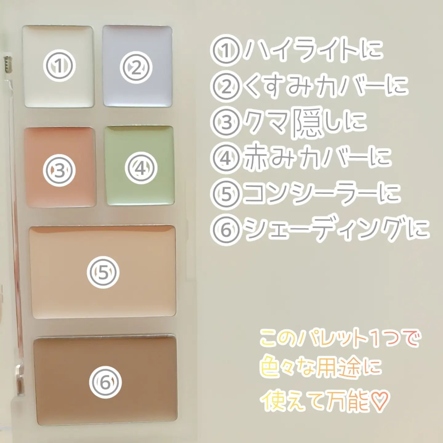 - 6色のカラーが入った、コンシーラーパレットで、コンシーラーとしてだけでなく、シェーディング、ハイライト、トーン調整が可能です。 ピーチ: クマカバーにおすすめ。保湿力が高く、ナチュラルなツヤ感です。 グリーン:ニキビや赤みのカバーにおすすめ。滑らかなテクスチャーで、カバー力が高いです。 パープル: くすみカバーにおすすめ。保湿力が高く、ナチュラルなツヤ感です。 ハイライト: 光の屈折を利用し、自然で柔らかい輝きを与えます。 シェーディング: 自然に影を演出し、しっかりと密着します。 コンシーラー: 滑らかなテクスチャーで、カバー力が高いです。