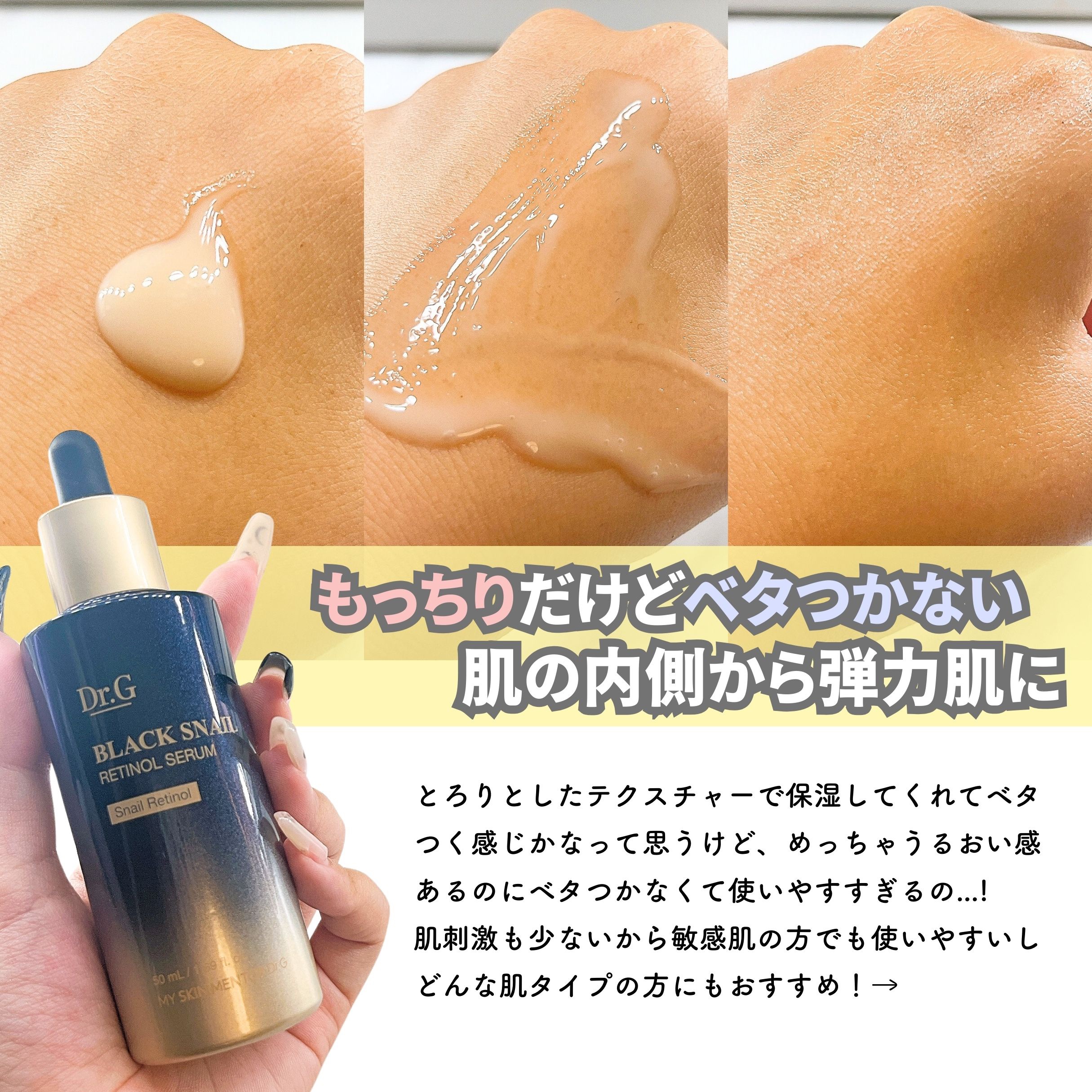 ブラックスネイルと低刺激のレチノールを配合した美容液 とろみがあってミルキーなテクスチャー なめらかにすべるように伸びて気持ちいい使用感で好き ブラックスネイル20%配合クリーム もっちりとした弾力を感じるテクスチャー なめらかに伸びてべたつかない Dr.Gが開発した独自成分のブラックスネイルレチノールは刺激が少なく効果的◎ アトピーもちの敏感肌、乾燥肌だけどトラブルなく使えてるよ♪