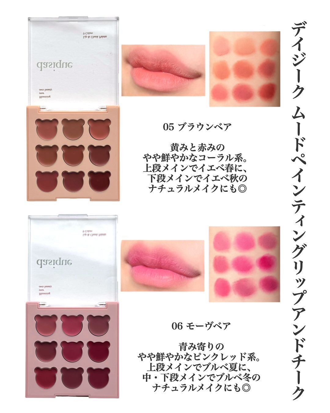 触るのがもったいなくらいに可愛い Dasiqueのマイベアコレクション🧸🤎 ふんわりした粉質にふんわりしたムードの9色パレット🤍 チークは触るとプニっとするクリームのようなゼリーのような新感覚で湿度感がありながらもサラっと密着してふんわりほっぺに仕上がるの🥹💗