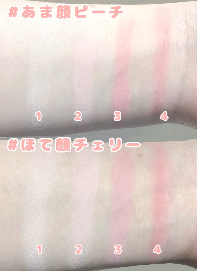 - <02 あま顔ピーチ> ①タルク、シリカ、マイカ、合成ワックス、ラウリン酸ヘキシル、ポリメチルシルセスキオキサン、(ビニルジメチコン/メチコンシルセスキオキサン)クロスポリマー、トリエトキシカプリリルシラン、ジフェニルシロキシフェニルトリメチコン、トリ(カプリル酸/カプリン酸)グリセリル、ジメチコン、カプリリルグリコール、水酸化Al、エチルヘキシルグリセリン、酢酸トコフェロール、水添レシチン、アミノプロピルトリエトキシシラン、酸化チタン、赤201、黄4、赤226、酸化鉄 ②ジメチコン、(ジメチコン/ビニルトリメチルシロキシケイ酸)クロスポリマー、イソノナン酸イソノニル、ポリメチルシルセスキオキサン、トリベヘニン、トリイソステアリン酸ポリグリセリル‒2、(VP/ヘキサデセン)コポリマー、合成ワックス、ラウリルPEG‒9ポリジメチルシロキシエチルジメチコン、イソステアリン酸ソルビタン、フェノキシエタノール、(ジメチコン/ビニルジメチコン)クロスポリマー、メドウフォーム種子油、スクワラン、酢酸トコフェロール、トリエトキシカプリリルシラン、水酸化Al、エチルヘキシルグリセリン、アミノプロピルトリエトキシシラン、トコフェロール、酸化チタン、赤226、酸化鉄、黄4、赤227 ③タルク、シリカ、合成ワックス、マイカ、ラウリン酸ヘキシル、ポリメチルシルセスキオキサン、(ビニルジメチコン/メチコンシルセスキオキサン)クロスポリマー、トリエトキシカプリリルシラン、ジフェニルシロキシフェニルトリメチコン、トリ(カプリル酸/カプリン酸)グリセリル、ジメチコン、カプリリルグリコール、水酸化Al、エチルヘキシルグリセリン、酢酸トコフェロール、水添レシチン、酸化チタン、グンジョウ、赤226、黄4、酸化鉄 ④タルク、マイカ、シリカ、合成ワックス、ポリメチルシルセスキオキサン、トリエトキシカプリリルシラン、フェニルトリメチコン、ジメチコン、トリ(カプリル酸/カプリン酸)グリセリル、ラウリン酸ヘキシル、(ビニルジメチコン/メチコンシルセスキオキサン)クロスポリマー、カプリリルグリコール、水添レシチン、水酸化Al、エチルヘキシルグリセリン、酢酸トコフェロール、酸化チタン、グンジョウ、酸化鉄、赤226 <03 ほて顔チェリー> ①タルク、シリカ、合成ワックス、マイカ、ラウリン酸ヘキシル、ポリメチルシルセスキオキサン、(ビニルジメチコン/メチコンシルセスキオキサン)クロスポリマー、トリエトキシカプリリルシラン、ジフェニルシロキシフェニルトリメチコン、トリ(カプリル酸/カプリン酸)グリセリル、ジメチコン、カプリリルグリコール、水酸化Al、エチルヘキシルグリセリン、酢酸トコフェロール、水添レシチン、アミノプロピルトリエトキシシラン、酸化チタン、グンジョウ、赤226、赤201、黄4 ②ジメチコン、(ジメチコン/ビニルトリメチルシロキシケイ酸)クロスポリマー、イソノナン酸イソノニル、トリベヘニン、ポリメチルシルセスキオキサン、トリイソステアリン酸ポリグリセリル‒2、(VP/ヘキサデセン)コポリマー、合成ワックス、ラウリルPEG‒9ポリジメチルシロキシエチルジメチコン、イソステアリン酸ソルビタン、フェノキシエタノール、(ジメチコン/ビニルジメチコン)クロスポリマー、酢酸トコフェロール、スクワラン、メドウフォーム種子油、トリエトキシカプリリルシラン、水酸化Al、エチルヘキシルグリセリン、トコフェロール、酸化チタン、赤226、酸化鉄、黄4、赤218、赤227、青1 ③タルク、シリカ、合成ワックス、マイカ、ラウリン酸ヘキシル、ポリメチルシルセスキオキサン、(ビニルジメチコン/メチコンシルセスキオキサン)クロスポリマー、トリエトキシカプリリルシラン、ジフェニルシロキシフェニルトリメチコン、トリ(カプリル酸/カプリン酸)グリセリル、ジメチコン、カプリリルグリコール、エチルヘキシルグリセリン、酢酸トコフェロール、水酸化Al、水添レシチン、アミノプロピルトリエトキシシラン、酸化チタン、グンジョウ、赤226、黄4、赤218 ④タルク、マイカ、シリカ、合成ワックス、ポリメチルシルセスキオキサン、トリエトキシカプリリルシラン、トリ(カプリル酸/カプリン酸)グリセリル、ラウリン酸ヘキシル、フェニルトリメチコン、ジメチコン、(ビニルジメチコン/メチコンシルセスキオキサン)クロスポリマー、カプリリルグリコール、水添レシチン、水酸化Al、エチルヘキシルグリセリン、酢酸トコフェロール、酸化チタン、グンジョウ、赤226、酸化鉄、黄4 <05 めろ顔ロゼムース(数量限定)> ①タルク、シリカ、マイカ、合成ワックス、ラウリン酸ヘキシル、ポリメチルシルセスキオキサン、(ビニルジメチコン/メチコンシルセスキオキサン)クロスポリマー、ジフェニルシロキシフェニルトリメチコン、トリエトキシカプリリルシラン、トリ(カプリル酸/カプリン酸)グリセリル、ジメチコン、カプリリルグリコール、水酸化Al、エチルヘキシルグリセリン、水添レシチン、酸化チタン