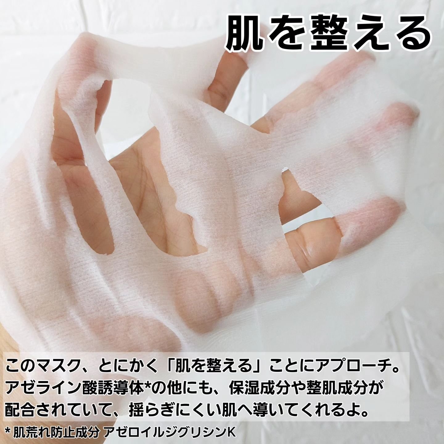 - 肌荒れ・皮脂ケア※1と健やかな肌の土台※2美容を叶える、アゼライン酸誘導体*1配合のうるおいツヤ肌管理マスクです。 肌荒れや肌の赤み、毛穴目立ちが気になる方に。 アゼライン酸*1×ナイアシンアミド*2+次世代ヒアルロン酸*3配合で、肌荒れをケアし、角質層をみずみずしいうるおいで満たします。 さらに肌表面でゆっくりと働くマイルドAHA*4が、古い角質をやわらげ、キメを整えることで、つるんとツヤめく素肌へ導きます。 シートはとろけるように肌に密着するメルティーフィールシートを採用。 シートが最も柔らかく感じられる液量を研究し、まるで水の層に包まれているような心地よさを実現しています。 (※1 ふき取りによる ※2 角質層のこと *1 肌荒れ防止成分 アゼロイルジグリシンK *2 整肌成分 *3 肌荒れ防止成分 加水分解ヒアルロン酸Na *4 整肌成分 マンデル酸)