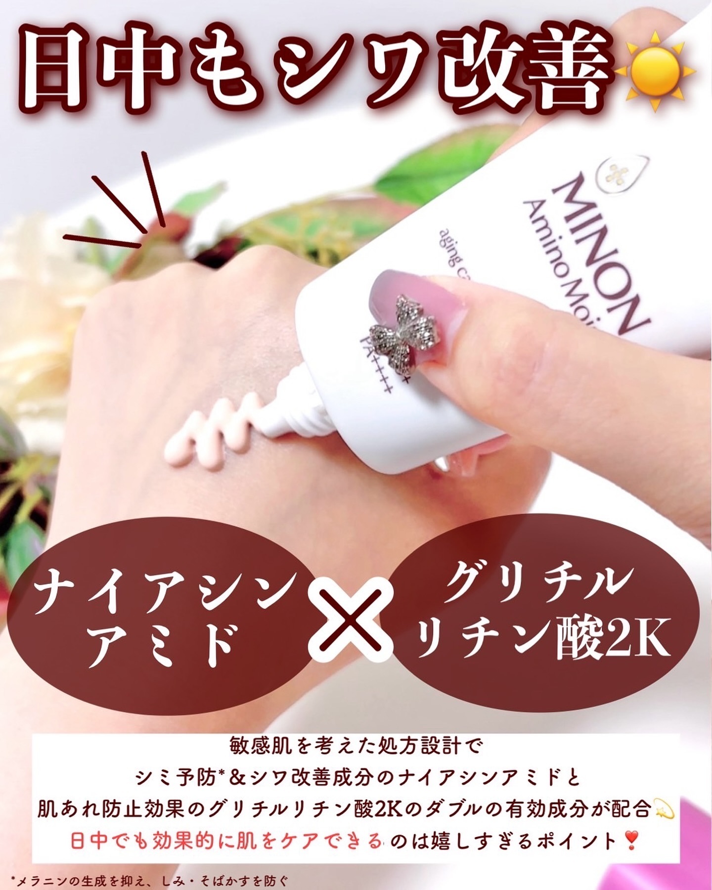 - 【シワ改善もできるUVクリーム】 SPF50+PA++++ シワ改善×UVカットが出来る薬用シワ改善UVクリーム。これ1本で美容クリーム・UVカット・化粧下地の3役。 シワ改善&しみ*予防成分「ナイアシンアミド」、肌あれ予防成分「グリチルリチン酸2K」配合。紫外線吸収剤&酸化亜鉛フリーで敏感肌を考えた処方。自然な輝きを放つ、やわらかなテクスチャーの化粧下地、見る角度で反射色が変わる「艶肌ダブルカラーパウダー」配合で自然な立体感を演出。 エイジングケア:年齢に応じたお手入れケア *メラニンの生成を抑え、しみ・そばかすを防ぐ (販売名:ミノンアミノモイストAU)【医薬部外品】
