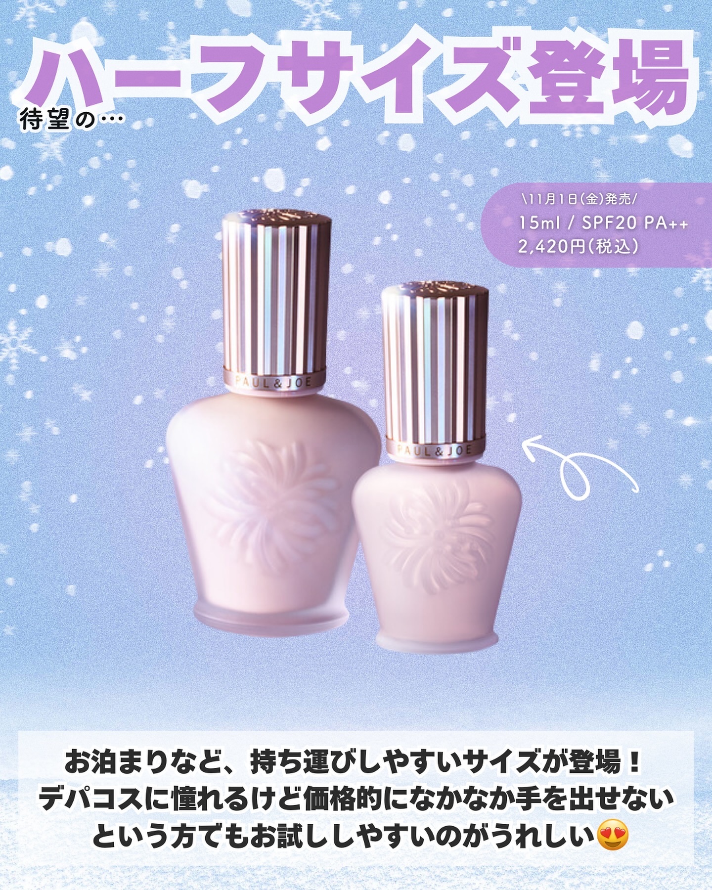 \✨限定ハーフサイズ登場✨/ポール&ジョーの大人気美容液プライマーの発売1周年を記念して、ハーフサイズが限定で登場するよ💗いつも愛用しているので旅行にも持って行きやすくて嬉しい〜!!🥰通常サイズと同じすりガラスデザインで、そのまま小さくなった...
