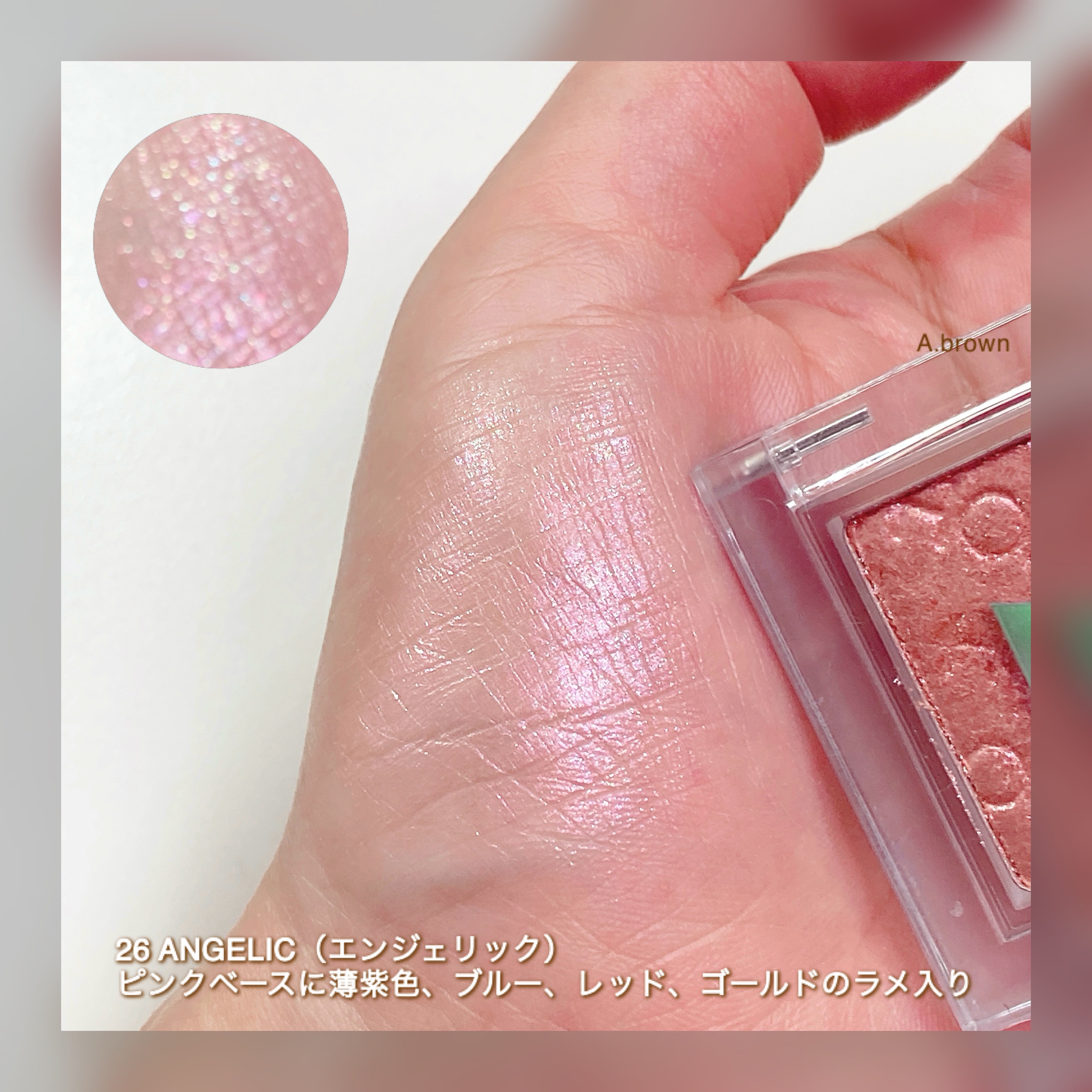 - さらさらほどける質感のアイシャドウ。 使いやすい絶妙なカラーバリエーションのシングルアイシャドウ。 【日本発売色6色】 <02ピンキッド> 自分の好みでパズルのように組み合わせて使えるアイシャドウ。乙女心をくすぐるかわいらしく優しいピンクカラー。 <20ツーショットアメリカーノ> 自分の好みでパズルのように組み合わせて使えるアイシャドウ。ライナーのように活用できるディープブラウン。 <22ベベ> 自分の好みでパズルのように組み合わせて使えるアイシャドウ。涙袋ハイライターにオススメなピンキッシュベージュシマー。 <26エンジェリック> 自分の好みでパズルのように組み合わせて使えるアイシャドウ。クールピンクに紫色、レッドなどのラメがカラフルにきらめくグリッター。 <28ムーンシャイン> 自分の好みでパズルのように組み合わせて使えるアイシャドウ。ベージュにゴールド、シルバーラメがクラシックに輝くグリッター。 <31ウィッティ> 自分の好みでパズルのように組み合わせて使えるアイシャドウ。可憐なベージュにピンク、レッド、パープルのラメが上品に輝くグリッター。