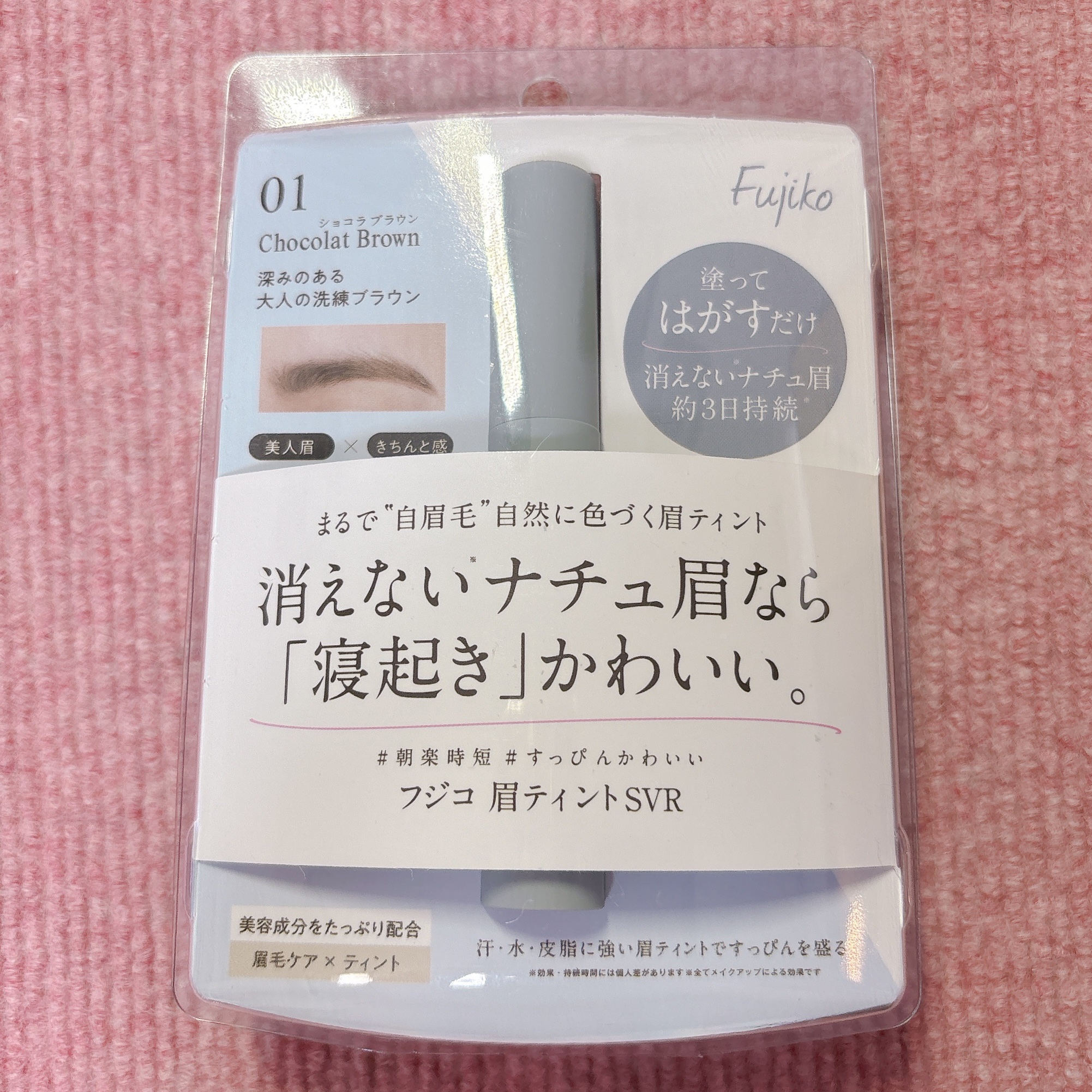 フジコ眉ティント 01ショコラブラウン 1,485円 (税込)です。眉ティント??ちょっと使いにくそう……、めっちゃ濃くなるのでは?って思ってたけど、これがすっごく使いやすかった✨ カラーが絶妙だから垢抜け眉にもおすすめ👀💓 私のおすすめの使い方は、眉のベースに眉ティントを仕込んでおくこと! 5種の美容成分が配合されているから特に荒れることはなかったよ🌸