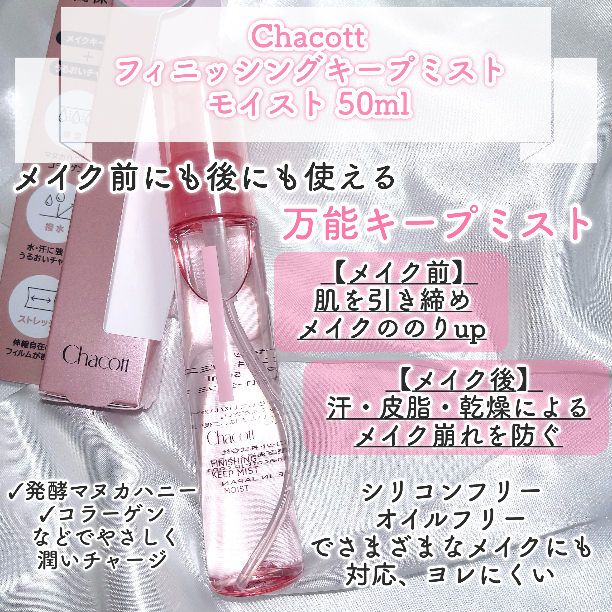 | フィックスミストランキング第1位 | ベースの崩れが皮脂より乾燥からくる人に特にオススメ✨ サラッとというより、しっとりツヤ肌感 | 詳細を見る | |