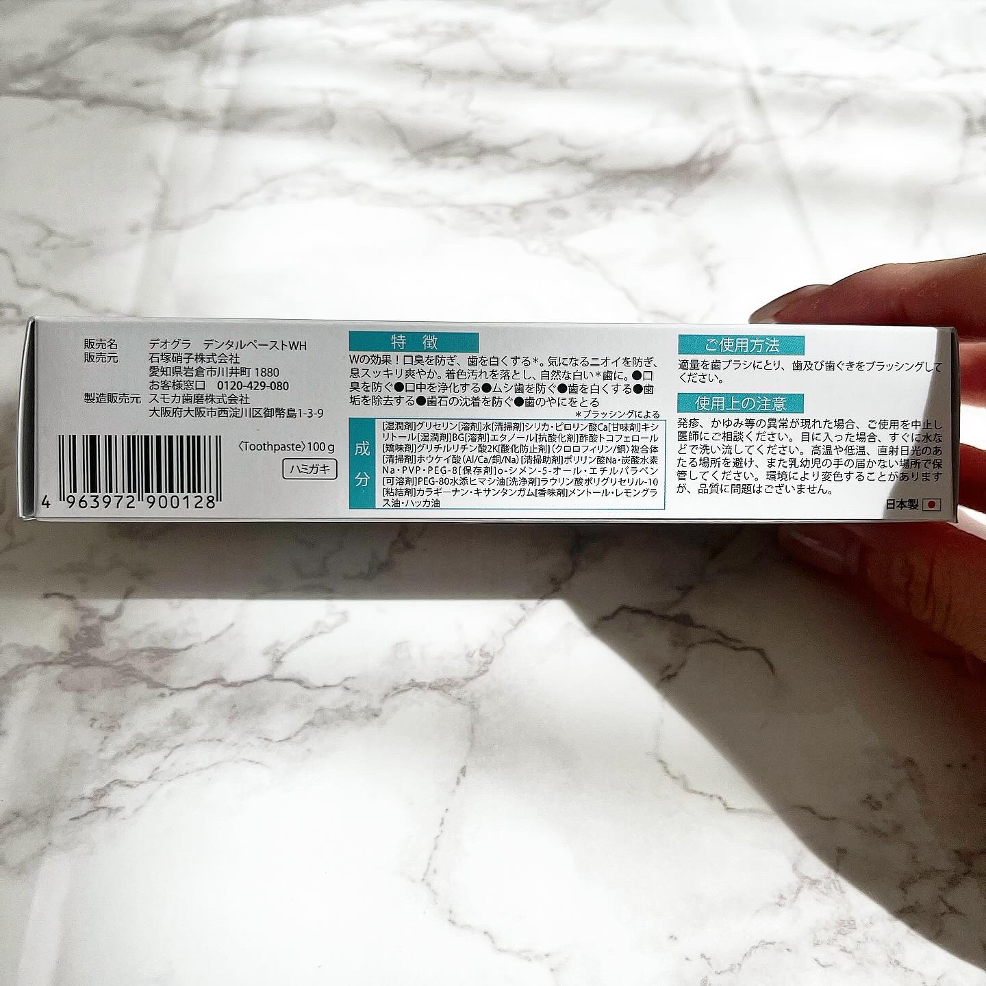 - \独自成分「DEOGLA®︎」(清掃剤)配合/ 創業200年を超える素材メーカーがつくる口臭ケアに特化した歯磨き粉! 製品の特長: 多数のご要望をいただいていた、口臭とホワイトニング *を1本でケアいただけます。ホワイトニング *はもちろん、独自成分DEOGLA配合で口臭にアプローチ。 徹底的にこだわった成分を配合しているので、口臭ケアとしてだけでなくお口のトータルケアにご活用ください。 ミントが苦手な方にもおすすめな、レモングラス香味、控え目な泡立ちでしっかりとブラッシングしていただけます。 ▶独自成分DEOGLA : 化粧品成分名称 ホウケイ酸(Al/Ca/銅/Na) *ブラッシングによる