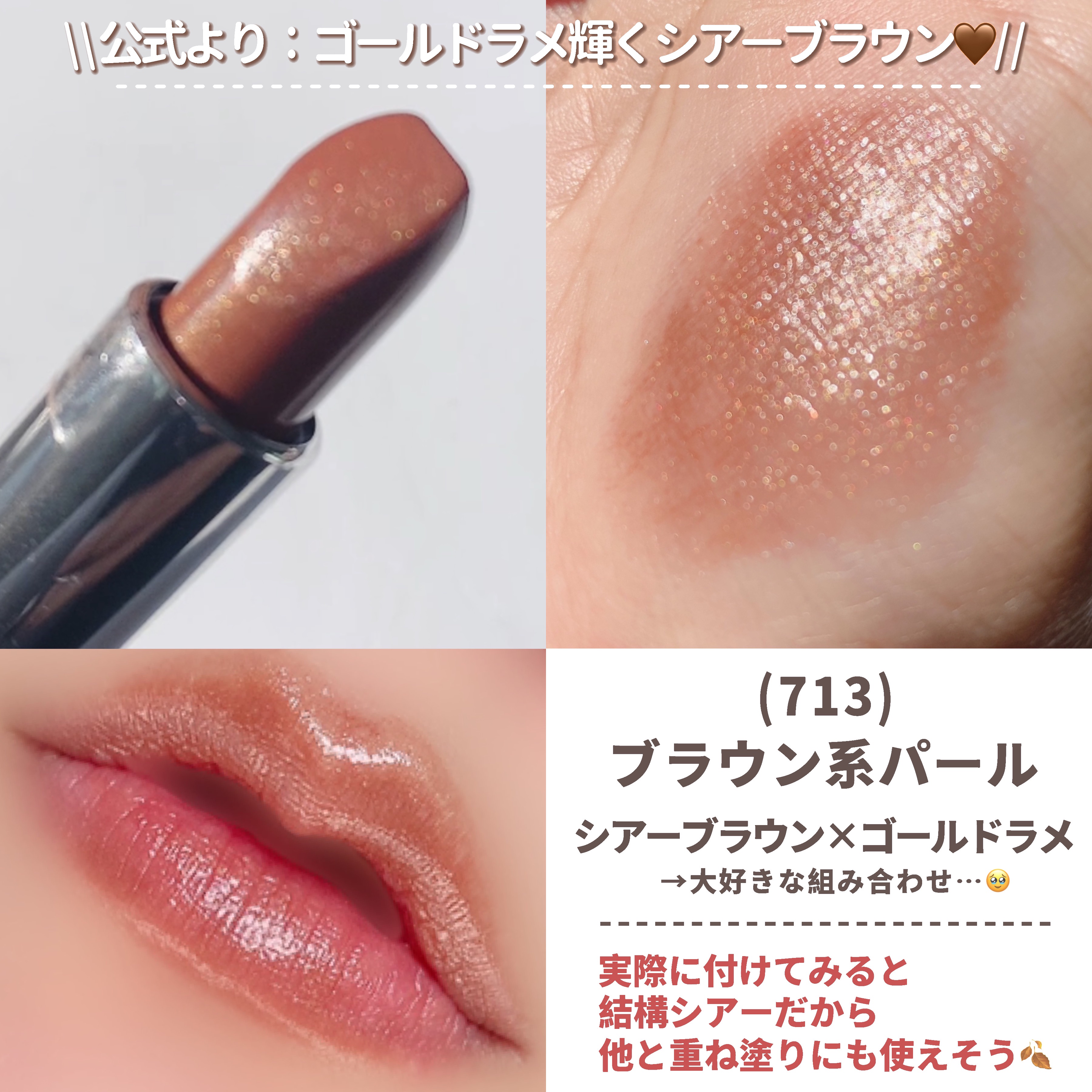 385円の透け感たっぷりブラウンリップ💄 なにこの可愛いブラウンリップ!!!!こんなにうるおい感あってなめらかだった? 透け感たっぷりの中にゴールド系のパールたっぷり… 色持ちは普通だけどさ、別に私は荒れたりしないし 385円とか大満足でしかない🥺💓 専用ケース無くても使えるんだけど、キャップはずれやすいと思うからケースも買った方がいいかも!