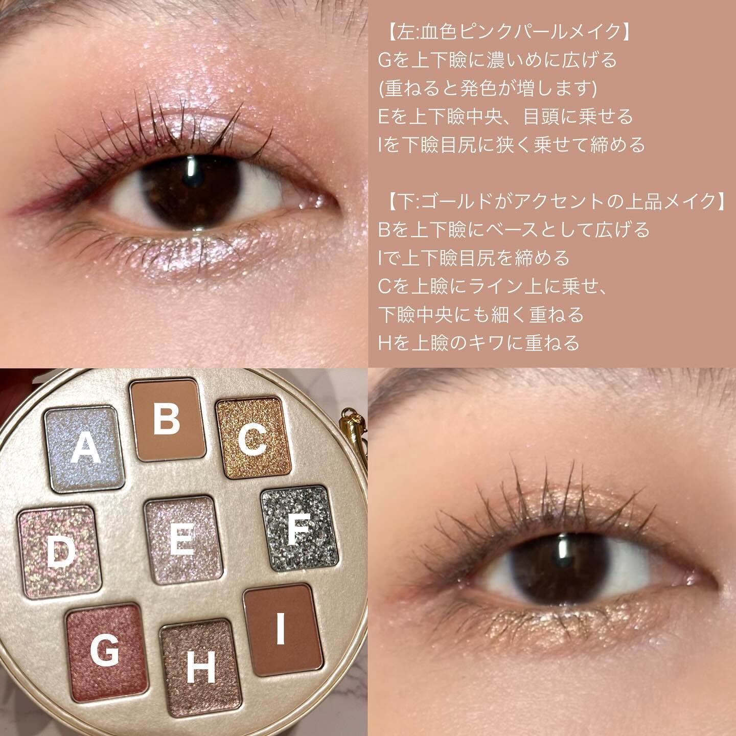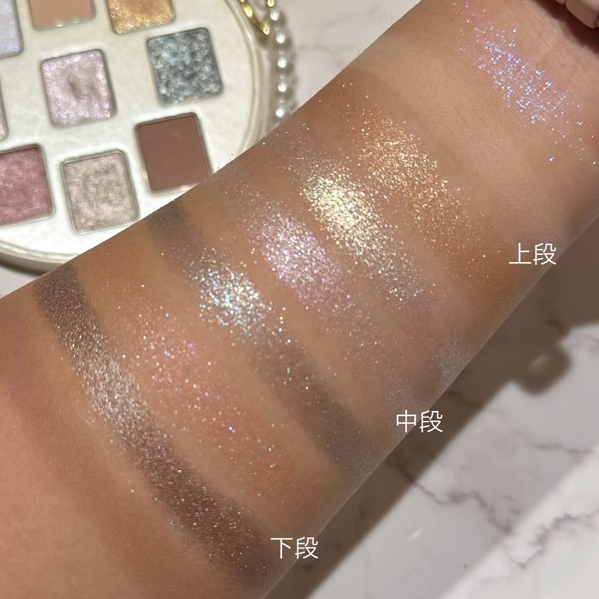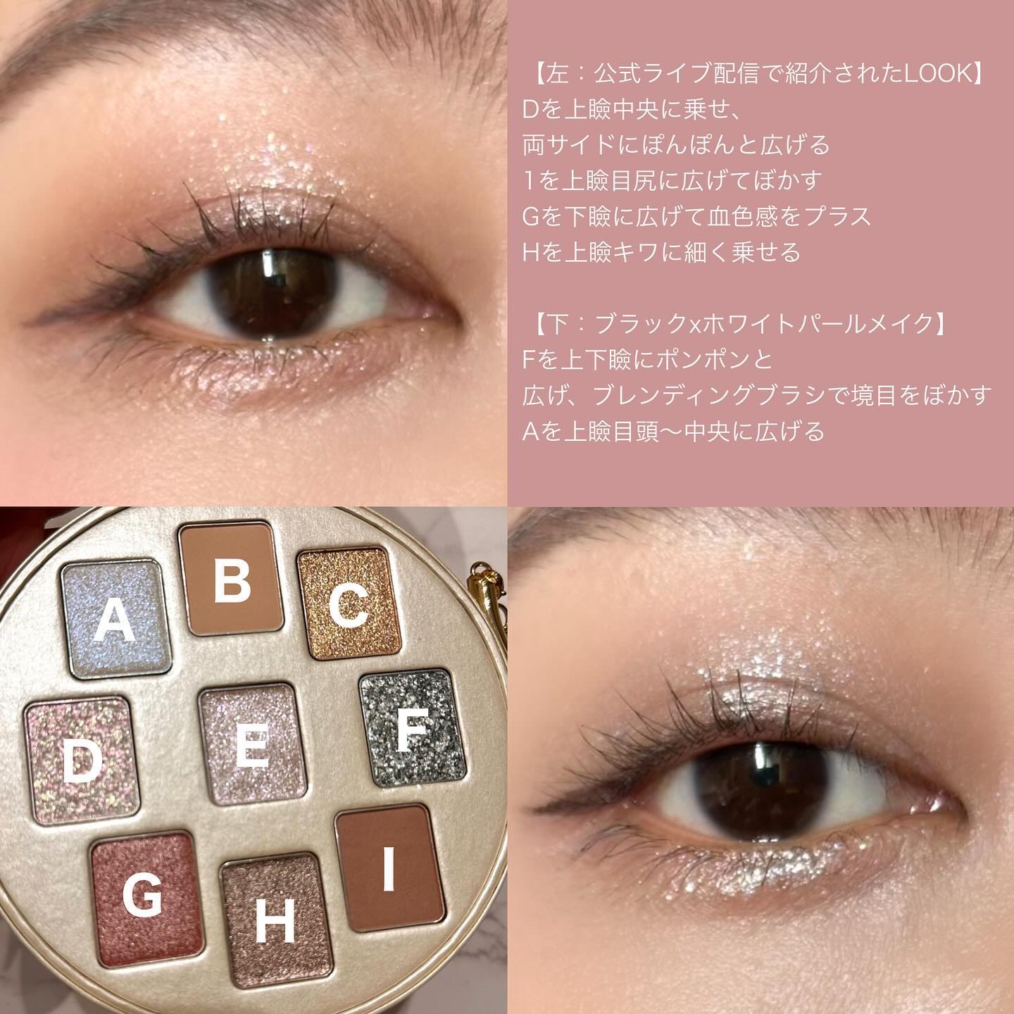 このパレットは、黄味が少なめでブルベにも使いやすいブラウン。 発色はしっかり目だけど、ブラシで調節も可能なので幅広い人に使いやすいパレットだと思います🎀✨ ラメ感も少しずつ異なり、華やかさを抑えたい時は右上を多めに使うと品の良いツヤのあるピンクブラウンメイクになります💎✨ 左上のラメカラーは白っぽいのでどんなアイシャドウとも相性抜群! この可愛い色味と煌びやかなラメは唯一無二です!