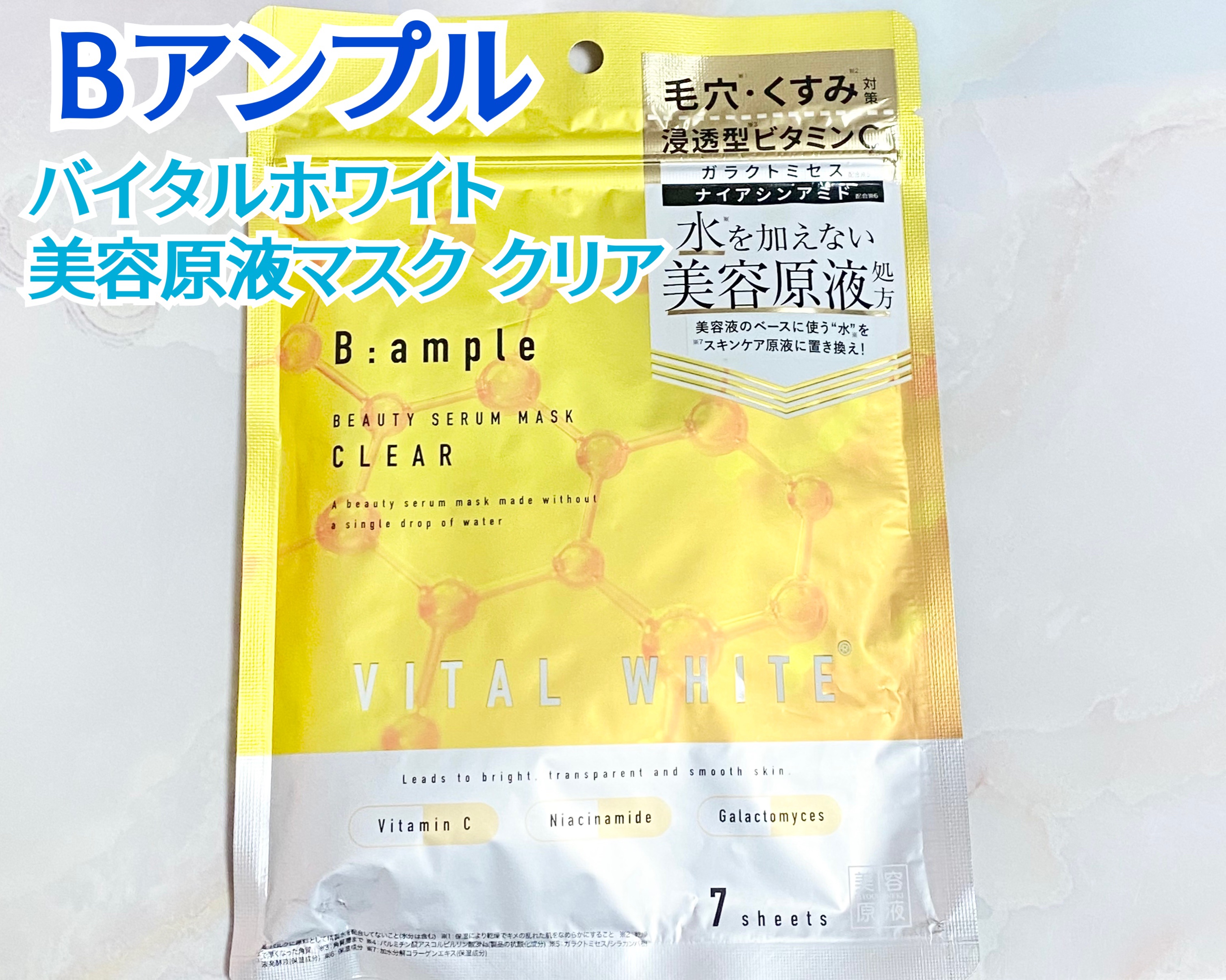 シートマスクの大部分を占めると言われる『水』をコラーゲン原液に置き換え、贅沢を極めた『水を加えない』美容原液マスクとのこと。 浸透型VC、ガラクトミセス、ナイアシンアミドと嬉しい成分が配合されていて、毛穴・くすみにアプローチするクリアタイプ。 パッケージのイエローがビタミンCを連想させてくれるので気分上がります♪