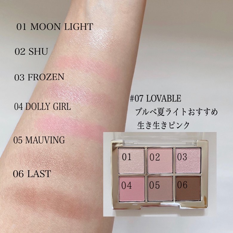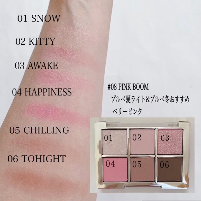 - <04 ニューデイ> タルク、マイカ、ジメチコン、合成フルオロフロゴパイト、酸化鉄、酸化チタン、ホウケイ酸(Ca/チタン)、ナイロン-12、オクテニルコハク酸デンプンAl、シリカ、メタクリル酸メチルクロスポリマー、窒化ホウ素、ステアロイルオキシステアリン酸オクチルドデシル、フェニルトリメチコン、ミリスチン酸Mg、ジエチルヘキサン酸ネオペンチルグリコール、メチルプロパンジオール、ラウリン酸ヘキシル、ヘキサ(ヒドロキシステアリン酸/ステアリン酸/ロジン酸)ジペンタエリスリチル、グンジョウ、(ジメチコン/ビニルジメチコン)クロスポリマー、ホウケイ酸(Ca/Al)、プロパンジオール、ステアリン酸Mg、(セバシン酸/イソパルミチン酸)ジグリセリル、トリエトキシカプリリルシラン、トリ(カプリル酸/カプリン酸)グリセリル、トリエチルヘキサノイン、セスキイソステアリン酸ソルビタン、マカデミア種子油、リンゴ酸ジイソステアリル、マンガンバイオレット、フェノキシエタノール、ステアリン酸ジメチコノール、合成ワックス、ラウロイルリシン、水酸化Al、メチコン、酸化スズ、サラソウジュ種子脂、水添レシチン、カルミン、カオリン、黄4、赤226、マルトデキストリン、トコフェロール <07 ラヴァブル> タルク、ジメチコン、マイカ、合成フルオロフロゴパイト、酸化チタン、シリカ、ホウケイ酸(Ca/チタン)、メタクリル酸メチルクロスポリマー、酸化鉄、マンガンバイオレット、ステアロイルオキシステアリン酸オクチルドデシル、オクテニルコハク酸デンプンAl、ホウケイ酸(Ca/Na)、ミリスチン酸Mg、メチルプロパンジオール、ジエチルヘキサン酸ネオペンチルグリコール、トリ(カプリル酸/カプリン酸)グリセリル、ホウケイ酸(Ca/Al)、フェニルトリメチコン、ラウリン酸ヘキシル、(ジメチコン/ビニルジメチコン)クロスポリマー、硫酸Ba、ヘキサ(ヒドロキシステアリン酸/ステアリン酸/ロジン酸)ジペンタエリスリチル、プロパンジオール、ナイロン-12、(セバシン酸/イソパルミチン酸)ジグリセリル、グンジョウ、マカデミア種子油、ステアリン酸Mg、セスキイソステアリン酸ソルビタン、トリエトキシカプリリルシラン、リンゴ酸ジイソステアリル、カルミン、合成ワックス、水添レシチン、カオリン、ラウロイルリシン、水酸化Al、酸化スズ、赤226、メチコン、マルトデキストリン、トコフェロール <08 ピンクブーム> タルク、マイカ、ジメチコン、合成フルオロフロゴパイト、酸化チタン、酸化鉄、シリカ、メタクリル酸メチルクロスポリマー、ナイロン-12、窒化ホウ素、マンガンバイオレット、ホウケイ酸(Ca/Al)、トリ(カプリル酸/カプリン酸)グリセリル、ミリスチン酸Mg、フェニルトリメチコン、ステアロイルオキシステアリン酸オクチルドデシル、メチルプロパンジオール、ジエチルヘキサン酸ネオペンチルグリコール、ホウケイ酸(Ca/チタン)、グンジョウ、ラウリン酸ヘキシル、ホウケイ酸(Ca/Na)、ヘキサ(ヒドロキシステアリン酸/ステアリン酸/ロジン酸)ジペンタエリスリチル、(ジメチコン/ビニルジメチコン)クロスポリマー、プロパンジオール、(セバシン酸/イソパルミチン酸)ジグリセリル、ステアリン酸Mg、セスキイソステアリン酸ソルビタン、リンゴ酸ジイソステアリル、カルミン、マカデミア種子油、オクチルドデカノール、トリエトキシカプリリルシラン、水添レシチン、合成ワックス、ステアリン酸ジメチコノール、カオリン、赤226、酸化スズ、ラウロイルリシン、水酸化Al、メチコン、マルトデキストリン、黄4、トコフェロール <09 ドリームキャッチャー> タルク、マイカ、ジメチコン、合成フルオロフロゴパイト、酸化チタン、ホウケイ酸(Ca/Al)、オクテニルコハク酸デンプンAl、酸化鉄、メタクリル酸メチルクロスポリマー、シリカ、窒化ホウ素、ステアロイルオキシステアリン酸オクチルドデシル、フェニルトリメチコン、ホウケイ酸(Ca/チタン)、マンガンバイオレット、ミリスチン酸Mg、グンジョウ、メチルプロパンジオール、ジエチルヘキサン酸ネオペンチルグリコール、ラウリン酸ヘキシル、オクチルドデカノール、ヘキサ(ヒドロキシステアリン酸/ステアリン酸/ロジン酸)ジペンタエリスリチル、(ジメチコン/ビニルジメチコン)クロスポリマー、ナイロン-12、プロパンジオール、(セバシン酸/イソパルミチン酸)ジグリセリル、リンゴ酸ジイソステアリル、セスキイソステアリン酸ソルビタン、銀、ステアリン酸Mg、トリエトキシカプリリルシラン、炭酸Ca、ステアリン酸ジメチコノール、マカデミア種子油、合成ワックス、トリ(カプリル酸/カプリン酸)グリセリル、メチコン、カルミン、カオリン、酸化スズ、水添レシチン、水酸化Al、赤226、ラウロイルリシン、マルトデキストリン、トコフェロール <10 ピクニック> タルク、ジメチコン、マイカ、合成フルオロフロゴパイト、酸化チタン、シリカ、酸化鉄、メタクリル酸メチルクロスポリマー、トリ(カプリル酸/カプリン酸)グリセリル、オ
