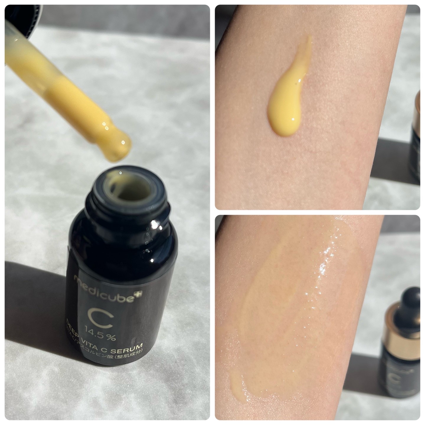 - 高濃縮のピュアビタミンC*やグルタチオン*をたっぷり配合した美容液です。 べたつかないテクスチャーで肌を保湿し、ツヤのある美肌に導きます。 ☑ピュアビタミンC* 145,000ppm配合 ☑独自整肌成分MELA-FADE ☑ナチュラルビタコンプレックス:カムカムの実エキス*・ビタミンツリーウォーター*・カカドゥプラムエキス*配合 ☑ビタミンの鮮度を維持するため、茶色の瓶3本に小分けしたパッケージを採用 ☑肌の角質層により浸透されやすい、こだわりのpH濃度(pH4.0以下)に設定 ☑乾燥によるくすみケア/弾力ケア/保湿ケア/肌キメケア 化粧水などでお肌を整えたあと、適量を取り、お肌のキメに沿ってまんべんなく塗った後、やさしくなじませます。 * 保湿成分 ■お肌に異常が生じていないかよく注意してご使用ください。化粧品がお肌に合わないとき即ち次のような場合には、使用を中止してください。そのまま使 用を続けますと、症状を悪化させることがありますので、皮膚科専門医等にご相談されることをおすすめします。また、傷やはれもの、しっしん等の異常が ある部位には、ご使用にならないでください。 (1)使用中、赤み、はれ、かゆみ、刺激、色抜け(白斑等)や黒ずみ等の異常があらわれた場合 (2)使用したお肌に、直射日光があたって上記のような異常があらわれた場合 ■目に入らないようご注意ください。目に入ったときは、こすらずにすぐに洗い流してください。その後、目に異常が残る場合は、眼科専門医へご相談され ることをおすすめします。 ■極端に高温又は低温の場所、低湿、高湿の場所、直射日光のあたる場所には保管しないでください。 ■衣類につくと、しみになることがございますのでご注意ください。 ■乳児、子供の手の届かない所に保管してください。
