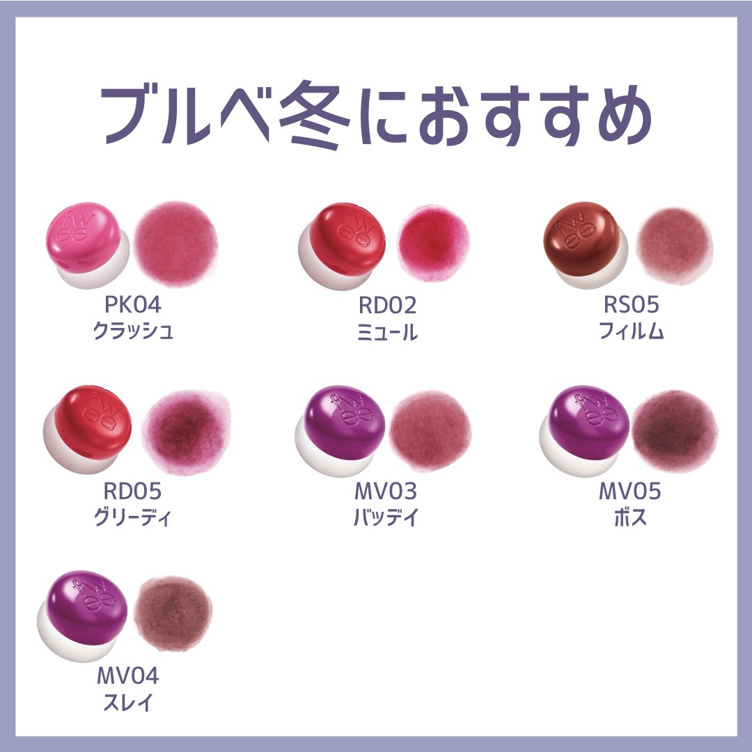 - <CR01 ディア> ダイメジメチコン、(ジメチコン/ビニルジメチコン)クロスポリマー、トリベヘニン、トリイソステアリン酸ポリグリセリル-2、リンゴ酸ジイソステアリル、合成フルオロフロゴパイト、二酸化チタン(CI 77891)、黄色酸化鉄(CI 77492)、カカオシードバター、ブルーアガベ葉エキス、セチルPEG/PPG-10/1ダイメチコン、イソステアリン酸ソルビタン、ビニルジメチコン/メチコンシルセスキオキサン)クロスポリマー、ポリヒドロキシステアリック酸、ジステアルジモニウムヘクトライト、パルミチン酸エチルヘキシル、ラウロイルサルコシン酸ナトリウム、アイソステアリック酸、レシチン、ジイソステアリン酸ポリグリセリル-2、ポリリシノレイン酸ポリグリセリル-3、クエン酸トリエチル、カプリリルグリコール、カプリル酸グリセリル、BG、精製水、香料、黄色5号(CI 15985)、赤色酸化鉄(CI 77491)、赤202(CI 15850)、黒色酸化鉄(CI 77499) <CR02 ボーイ> ダイメジメチコン、(ジメチコン/ビニルジメチコン)クロスポリマー、トリベヘニン、合成フルオロフロゴパイト、リンゴ酸ジイソステアリル、二酸化チタン(CI 77891)、トリイソステアリン酸ポリグリセリル-2、カカオシードバター、ブルーアガベ葉エキス、セチルPEG/PPG-10/1ダイメチコン、イソステアリン酸ソルビタン、ビニルジメチコン/メチコンシルセスキオキサン)クロスポリマー、ポリヒドロキシステアリック酸、ジステアルジモニウムヘクトライト、ジイソステアリン酸ポリグリセリル-2、パルミチン酸エチルヘキシル、ラウロイルサルコシン酸ナトリウム、アイソステアリック酸、レシチン、ポリリシノレイン酸ポリグリセリル-3、クエン酸トリエチル、カプリリルグリコール、カプリル酸グリセリル、BG、精製水、香料、黄色5号(CI 15985)、赤色104号(1) (CI 45410)、赤色酸化鉄(CI 77491)、赤202(CI 15850)、黄色4号(CI 19140) <CR03 ビーエフエフ> ダイメジメチコン、(ジメチコン/ビニルジメチコン)クロスポリマー、トリベヘニン、トリイソステアリン酸ポリグリセリル-2、リンゴ酸ジイソステアリル、合成フルオロフロゴパイト、二酸化チタン(CI 77891)、赤色104号(1) (CI 45410)、カカオシードバター、ブルーアガベ葉エキス、セチルPEG/PPG-10/1ダイメチコン、イソステアリン酸ソルビタン、ビニルジメチコン/メチコンシルセスキオキサン)クロスポリマー、ポリヒドロキシステアリック酸、ジイソステアリン酸ポリグリセリル-2、ジステアルジモニウムヘクトライト、パルミチン酸エチルヘキシル、ラウロイルサルコシン酸ナトリウム、アイソステアリック酸、レシチン、ポリリシノレイン酸ポリグリセリル-3、クエン酸トリエチル、カプリリルグリコール、カプリル酸グリセリル、BG、精製水、香料、黄色4号(CI 19140)、黄色酸化鉄(CI 77492)、赤202(CI 15850)、赤色201号 (CI 15850) <CR04 セブンティーン> ダイメジメチコン、(ジメチコン/ビニルジメチコン)クロスポリマー、トリベヘニン、リンゴ酸ジイソステアリル、トリイソステアリン酸ポリグリセリル-2、合成フルオロフロゴパイト、二酸化チタン、カカオシードバター、ブルーアガベ葉エキス、セチルPEG/PPG-10/1ダイメチコン、イソステアリン酸ソルビタン、ビニルジメチコン/メチコンシルセスキオキサン)クロスポリマー、ポリヒドロキシステアリック酸、ジステアルジモニウムヘクトライト、ジイソステアリン酸ポリグリセリル-2、パルミチン酸エチルヘキシル、ラウロイルサルコシン酸ナトリウム、アイソステアリック酸、レシチン、ポリリシノレイン酸ポリグリセリル-3、クエン酸トリエチル、カプリリルグリコール、カプリル酸グリセリル、BG、精製水、香料、赤色酸化鉄、赤色201号、黄色4号、赤色202号、黄色酸化鉄 <CR05 ガールズ> ダイメジメチコン、(ジメチコン/ビニルジメチコン)クロスポリマー、トリベヘニン、トリイソステアリン酸ポリグリセリル-2、合成フルオロフロゴパイト、黄色5号(CI 15985)、リンゴ酸ジイソステアリル、カカオシードバター、ブルーアガベ葉エキス、セチルPEG/PPG-10/1ダイメチコン、イソステアリン酸ソルビタン、ビニルジメチコン/メチコンシルセスキオキサン)クロスポリマー、ポリヒドロキシステアリック酸、ジイソステアリン酸ポリグリセリル-2、ジステアルジモニウムヘクトライト、パルミチン酸エチルヘキシル、ラウロイルサルコシン酸ナトリウム、アイソステアリック酸、レシチン、ポリリシノレイン酸ポリグリセリル-3、クエン酸トリエチル、カプリリルグリコール、カプリル酸グリセリル、BG、精製水、香料、黄色4号(CI 19140)、赤202(CI 15850)、二酸化チタン(CI 77891)、赤色201号 (CI 15850) <MV01 チリン> ダイメジメチコン、(ジメチコン/ビニルジメチコン)クロスポリマー、トリベヘニン、トリイソステアリン酸ポリグリセリル-2、リンゴ酸ジイソステアリル、合成フルオロフロゴパイト、酸化チタン (CI 77891)、赤色酸化鉄(CI 77491)、黄色酸化鉄(CI 77492)、カカオシードバター、ブルーアガベ葉エキス、セチルPEG/PPG-10/1ダイメチコン、イソス