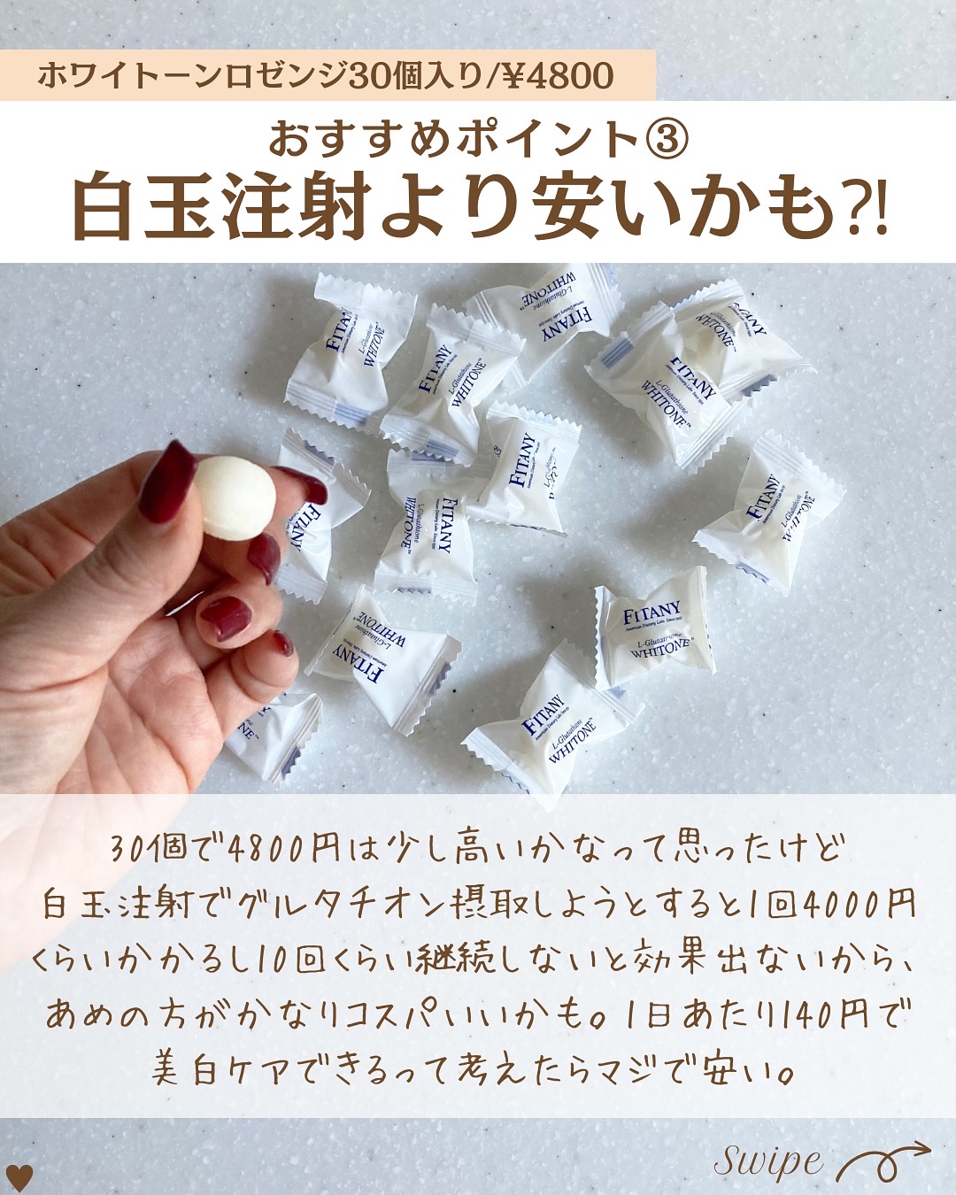 いつも見てくれてありがとうございます🥰 他の投稿はこちらから▷▷▷ @tsuyako__beauty @nukhan_jp ニューカン様から商品をご提供いただきました🙂‍↕️ こんばんは!つや子です💕 今日は「韓国サプリで迷ってる方向けおすすめ8選」をご紹介します💁‍♀️ 年々減少していく栄養素… 毎日の食事で補うのはけっこう 難しいよね、、💦 そんなときのお助けマンサプリ☝🏻 今、美容大国韓国🇰🇷でもっとも 人気な8選を集めたんだけど その中でも「ホワイトーンロゼンジ」は 舐めるグルタチオンで有名で、 くすみを取っ払ってくれるあめちゃん! SNSでかなりバズってるから 知ってる人もいるかも⁈ 他のサプリもほんっとに良くておすすめ! 投稿内で詳しく解説してるので チェックしてみてね☺️✨ 韓国🇰🇷のオリーブヤングで見つけたら 絶対試してみてください😘 Qoo10でも販売してます♡ ①ニューカン  ヒアルパワー  10本入り ¥3735   ②ニューカン  グルタチオン1000ブライトフィット  90錠 ¥9065 ③ニュートリワン  低分子コラーゲンS  30包 ¥4205 ④セルトリオン 低分子コラーゲン・グルタチオン  30包 ¥3600 ⑤ディプト  3日ストロングプラス  8包 ¥2620 ⑥ディプト  3日かぼちゃひとつ  10包 ¥3121 ⑦フードオロジー  コレオロジーカットジェル  10包×2パック ¥5500 ⑧オネスト  トリプルコラーゲン オレンジ味🍊  14包 ¥6600 金額は参考まで💁‍♀️ 保存しとくと後で見返せて便利だよ💓 𓂃𓂃𓂃𓂃𓂃𓂃𓂃𓂃𓂃𓂃𓂃𓂃𓂃𓂃𓂃𓂃 ダントツな美肌になれるˎˊ˗ お金をかけなくてもキレイになりたいを 応援する40代元美容部員の情報発信部屋💁‍♀️  ̄ ̄ ̄ ̄ ̄ ̄ ̄ ̄ 他の投稿はこちらから ▷▷▷@tsuyako__beauty  ̄ ̄ ̄ ̄ ̄ ̄ ̄ ̄ #インナーケア#40代美容#美肌#アンチエイジング#韓国おすすめサプリ