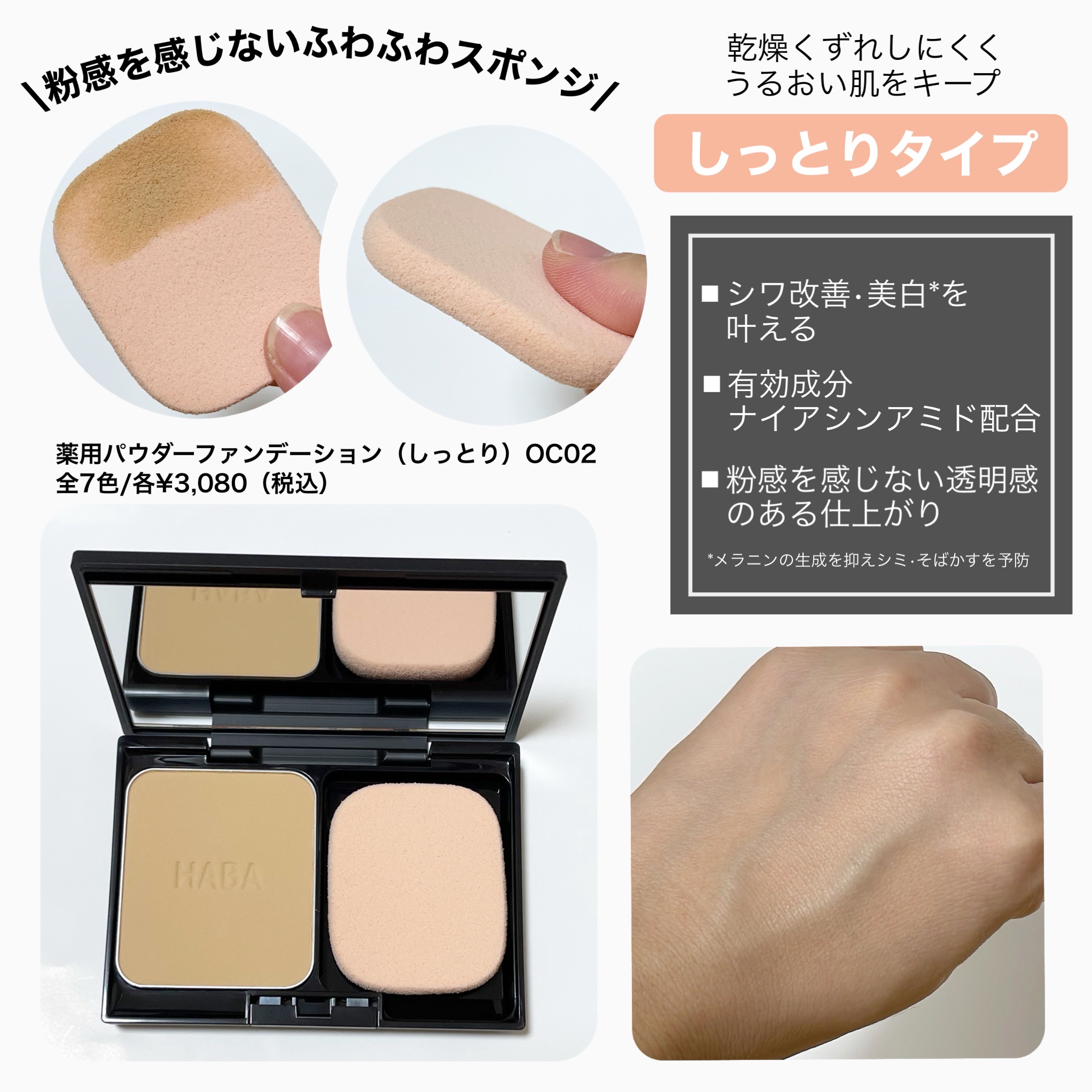 肌に負担をかけずに美しく魅せるメイクアイテムをラインナップする「HABA(ハーバー)」のパウダーファンデーション。 美白とシワ改善の有効成分ナイアンアミドを配合し、メイクするたびに透明感とハリに満ちた肌へ導いてくれるんだそう♡ なめらかな塗り心地でピタッとフィットして、毛穴や色ムラをふんわりカバーしてくれたよ♪