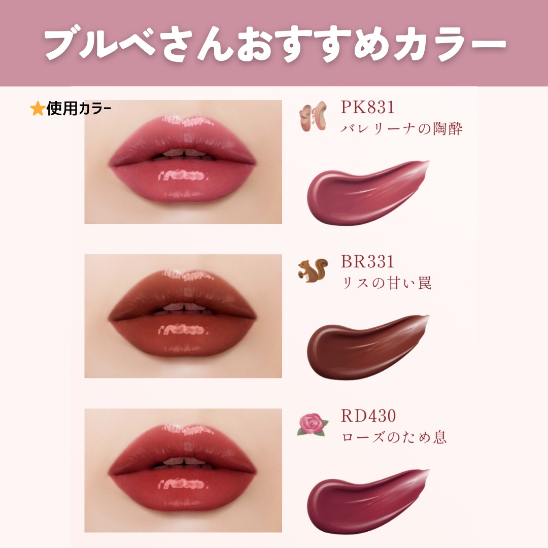 - <BE330 したたるアプリコット> 水、水添ポリイソブテン、BG、ダイマージリノレイル水添ロジン縮合物、リンゴ酸ジイソステアリル、ワセリン、ミネラルオイル、トリイソステアリン酸ポリグリセリル-2、TEA、エタノール、シロキクラゲエキス、ステビア葉/茎エキス、トコフェロール、ヒアルロン酸Na、PEG-10水添ヒマシ油、(アクリル酸Na/アクリロイルジメチルタウリンNa)コポリマー、(アクリレーツ/アクリル酸アルキル(C10-30))クロスポリマー、イソヘキサデカン、オレイン酸ソルビタン、カルボマー、スクワラン、ステアリン酸、ステアリン酸グリセリル、セテアリルアルコール、トリエチルヘキサノイン、ヒドロキシプロピルメチルセルロース、ベヘニルアルコール、ポリアクリル酸アンモニウム、ポリソルベート80、水酸化Al、フェノキシエタノール、酸化チタン、黄4、青1、赤227、橙205 <BE332 みつばちのワルツ> 水、水添ポリイソブテン、BG、ダイマージリノレイル水添ロジン縮合物、リンゴ酸ジイソステアリル、ワセリン、ミネラルオイル、トリイソステアリン酸ポリグリセリル-2、TEA、エタノール、ステビア葉/茎エキス、トコフェロール、ヒアルロン酸Na、PEG-10水添ヒマシ油、(アクリル酸Na/アクリロイルジメチルタウリンNa)コポリマー、(アクリレーツ/アクリル酸アルキル(C10-30))クロスポリマー、イソヘキサデカン、オレイン酸ソルビタン、カルボマー、シロキクラゲ多糖体、スクワラン、ステアリン酸、ステアリン酸グリセリル、セテアリルアルコール、トリエチルヘキサノイン、ヒドロキシプロピルメチルセルロース、ベヘニルアルコール、ポリアクリル酸アンモニウム、ポリソルベート80、水酸化Al、フェノキシエタノール、酸化チタン、黄4、青1、赤227、橙205 <BR331 リスの甘い罠> 水、水添ポリイソブテン、BG、ダイマージリノレイル水添ロジン縮合物、リンゴ酸ジイソステアリル、ワセリン、ミネラルオイル、トリイソステアリン酸ポリグリセリル-2、TEA、エタノール、シロキクラゲエキス、ステビア葉/茎エキス、トコフェロール、ヒアルロン酸Na、PEG-10水添ヒマシ油、(アクリル酸Na/アクリロイルジメチルタウリンNa)コポリマー、(アクリレーツ/アクリル酸アルキル(C10-30))クロスポリマー、イソヘキサデカン、オレイン酸ソルビタン、カルボマー、スクワラン、ステアリン酸、ステアリン酸グリセリル、セテアリルアルコール、トリエチルヘキサノイン、ヒドロキシプロピルメチルセルロース、ベヘニルアルコール、ポリソルベート80、フェノキシエタノール、黄4、青1、赤227、橙205 <OR230 焦がれるキャラメル> 水、水添ポリイソブテン、BG、ダイマージリノレイル水添ロジン縮合物、リンゴ酸ジイソステアリル、ワセリン、ミネラルオイル、トリイソステアリン酸ポリグリセリル-2、TEA、エタノール、シロキクラゲエキス、ステビア葉/茎エキス、トコフェロール、ヒアルロン酸Na、PEG-10水添ヒマシ油、(アクリル酸Na/アクリロイルジメチルタウリンNa)コポリマー、(アクリレーツ/アクリル酸アルキル(C10-30))クロスポリマー、イソヘキサデカン、オレイン酸ソルビタン、カルボマー、スクワラン、ステアリン酸、ステアリン酸グリセリル、セテアリルアルコール、トリエチルヘキサノイン、ヒドロキシプロピルメチルセルロース、ベヘニルアルコール、ポリアクリル酸アンモニウム、ポリソルベート80、水酸化Al、フェノキシエタノール、酸化チタン、黄4、青1、赤227、橙205 <PK830 フラミンゴの純情> 水、水添ポリイソブテン、BG、ダイマージリノレイル水添ロジン縮合物、リンゴ酸ジイソステアリル、ワセリン、ミネラルオイル、トリイソステアリン酸ポリグリセリル-2、TEA、エタノール、シロキクラゲエキス、ステビア葉/茎エキス、トコフェロール、ヒアルロン酸Na、PEG-10水添ヒマシ油、(アクリル酸Na/アクリロイルジメチルタウリンNa)コポリマー、(アクリレーツ/アクリル酸アルキル(C10-30))クロスポリマー、イソヘキサデカン、オレイン酸ソルビタン、カルボマー、スクワラン、ステアリン酸、ステアリン酸グリセリル、セテアリルアルコール、トリエチルヘキサノイン、ヒドロキシプロピルメチルセルロース、ベヘニルアルコール、ポリアクリル酸アンモニウム、ポリソルベート80、水酸化Al、フェノキシエタノール、酸化チタン、黄4、青1、赤227、橙205 <PK831 バレリーナの陶酔> 水、水添ポリイソブテン、BG、ダイマージリノレイル水添ロジン縮合物、リンゴ酸ジイソステアリル、ワセリン、ミネラルオイル、トリイソステアリン酸ポリグリセリル-2、TEA、エタノール、シロキクラゲエキス、ステビア葉/茎エキス、トコフェロール、ヒアルロン酸Na、PEG-10水添ヒマシ油、(アクリル酸Na/アクリロイルジメチルタウリンNa)コポリマー、(アクリレーツ/アクリル酸アルキル(C10-30))クロスポリマー、イソヘキサデカン、オレイン酸ソルビタン、カルボマー、スクワラン、ステアリン酸、ステアリン酸グリセリル、セテアリルアルコール、トリエチルヘキ