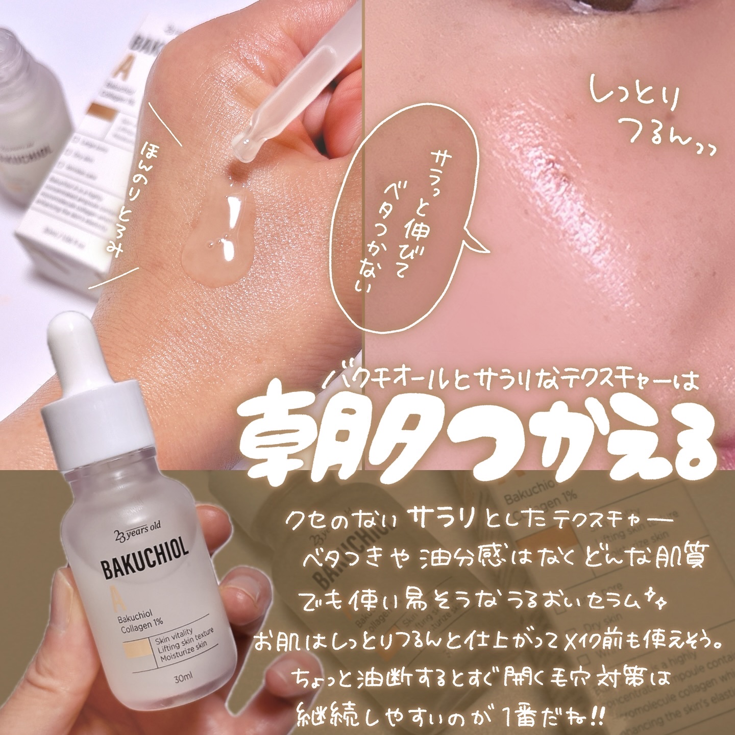 植物由来成分バクチオール配合。バクチオールは肌への刺激が少なく敏感肌さんにも使いやすい! 低分子コラーゲンの含有により肌のうるおいを維持してハリのある肌へ導きます。 とろみのあるテクスチャーでべたつきにくくキメが整いしっとりもちもちに🫧