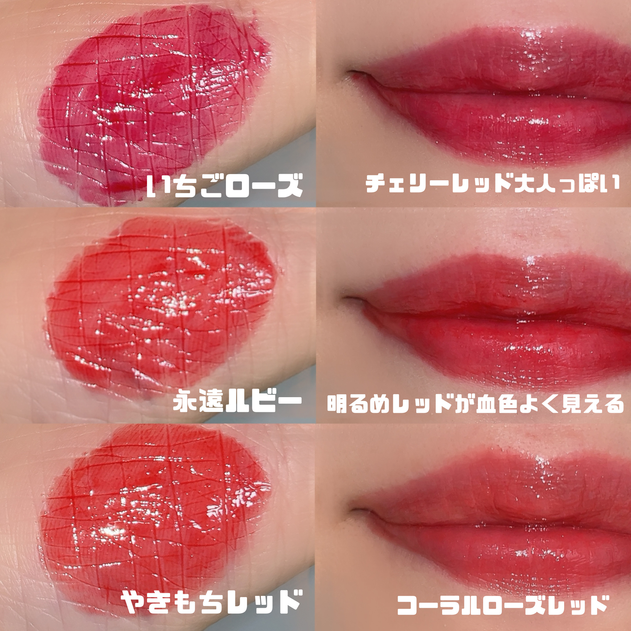 生き生きとした光沢と発色🍒潰した果肉カラー✨ 3号チリンチリン パーソナルカラー問わないピンクベージュが オフィス向きで使いやすかったよ🫶💓 4号ハッシュドチェリー パキッとしたブルベピンクなんだけど 顔が華やかに見えて大人っぽく完成❤️