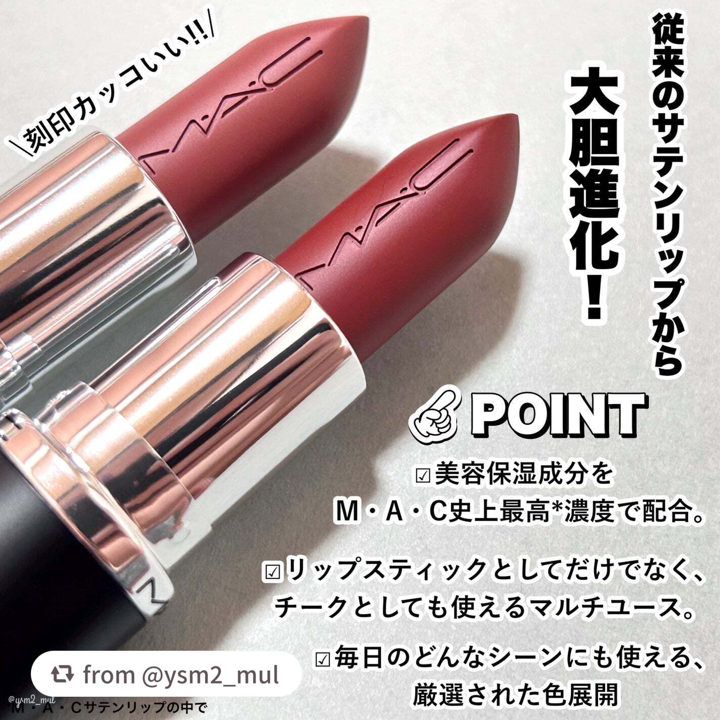 - <価格改定>2025年7月1日より¥4,620(税込)から¥4,400(税込)に改定いたします。 保湿成分をM・A・C史上最高*濃度で閉じ込め 驚きの濃密発色・贅沢なつや・うるおいで、つやオーラリップを作る #美容液サテンリップ が登場。 ①美容保湿成分をM・A・C史上最高*1濃度で配合した、#美容液サテンリップ: 新・マキシマルスリークサテンリップスティックは、高発色でありながら、乾燥レスなサテンのつやをまとわせます。 その秘密は、うるおいを作り出す厳選した天然由来の美容保湿成分をM•A•C史上最高*1濃度で配合しているから。美容の果実と言われる、ザクロから抽出されたザクロ花エキス*2をはじめ、ローズヒップオイル*2、ユチャ種子油*2を配合しています。 乾燥しがちな唇のすみずみまで濃厚な潤いを与え、みずみずしい仕上がりが続きます。 発色も欲しい、保湿も欲しい、そんな人の為の #美容液サテンリップです。 「発色は良いけど乾燥する」と思われてきたM•A•Cのリップが進化!発色と保湿を両立です。 ②リップ&チークのマルチユース: リップスティックとしてだけでなく、チークとしても使えます。 これ1本で、トレンドのワントーンメイクを簡単に表現できます。 ③毎日のどんなシーンにも使える、厳選された色展開: M•A•Cのリップは、派手な色が多くて、毎日使えない!ということはありません! 毎日の何気ないシーンやビジネスなど、デイリーに使いたいけどトレンド感も欲しい時、 お友達とのおでかけや飲み会、デートなど、おしゃれをしたい時、 パーティやクラブなど、華やかなメイクをしたい時、 厳選された21色の色展開で、どんな時でも、つやオーラのあるあなたへ導きます。 *1 M・A・Cサテンリップの中で *2 保湿成分 2024年10月4日 (金) 全国店舗・M・A・C公式オンラインショップ発売 2024年9月20日 (水) 楽天M・A・C公式ショップ/ZOZOCOSME M·A·C 公式ショップ 先行予約開始