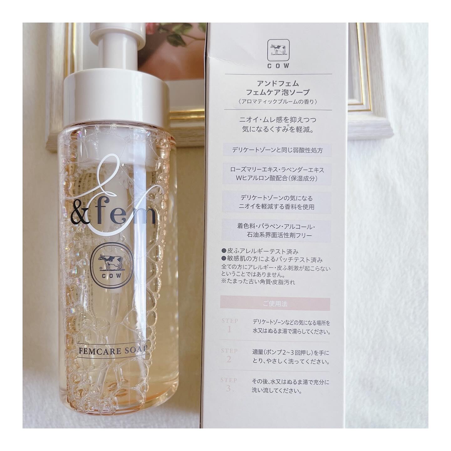 牛乳石鹸のフェムテックブランド &fem(アンドエム)のフェムケアソープ プッシュすると出てくる濃密な泡 控えめにほんのりとアロマティックブルームが香ります デリケートゾーンと同じpHの弱酸性処⽅で肌が敏感にふれる時期でも安心して使用できます