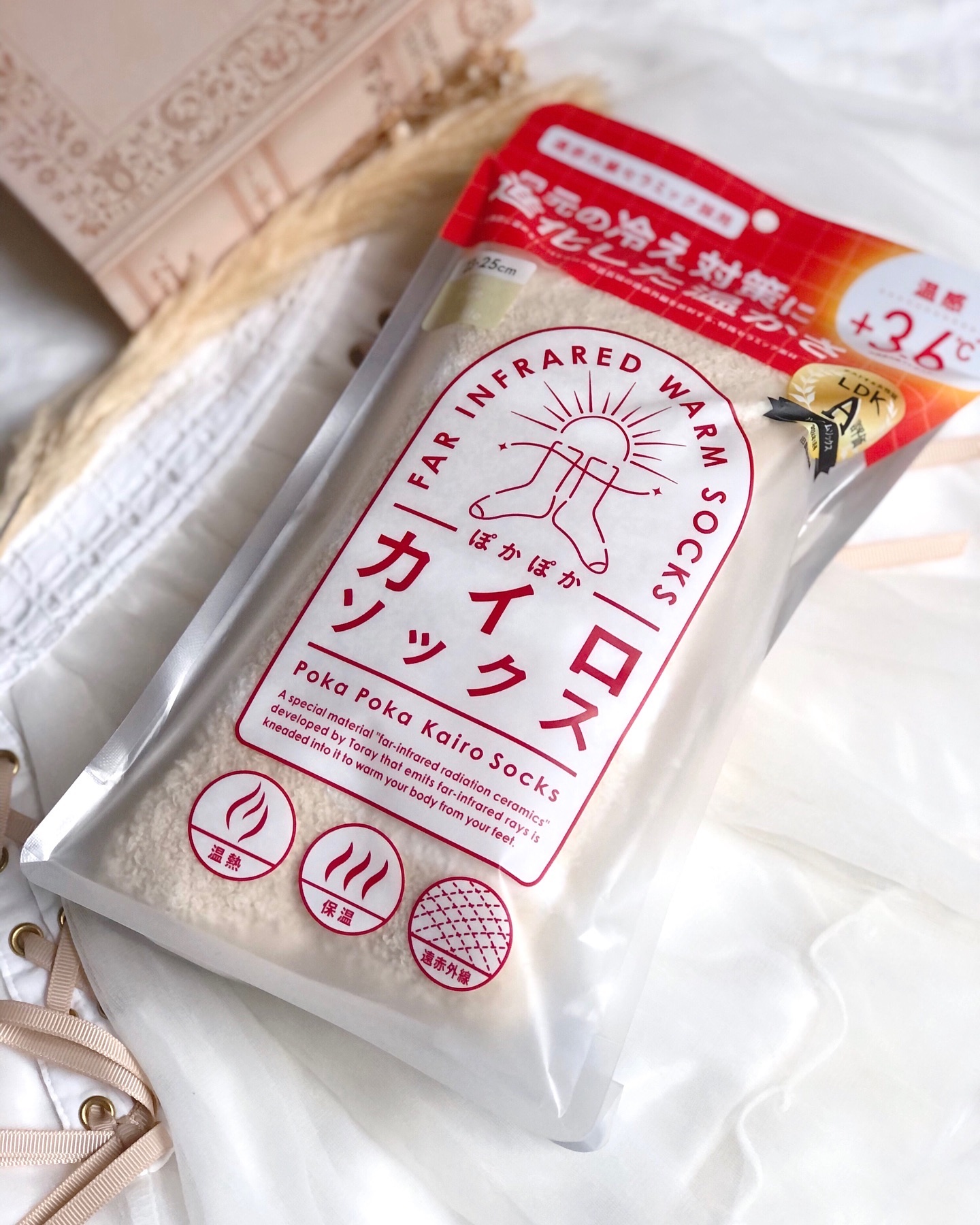 履くだけで足先の温感+3.6℃ のぽかぽか♡ 遠赤外線放射セラミックを練り込んだ繊維であたためてくれるのだけど、ホントにホントに暖かいの! 辛口コスメ評価誌の LDK では、A評価! これは納得の評価です! 靴下は膝下まであって、ズレにくいし、下がらない。 しっかり脚にフィットしてるの。