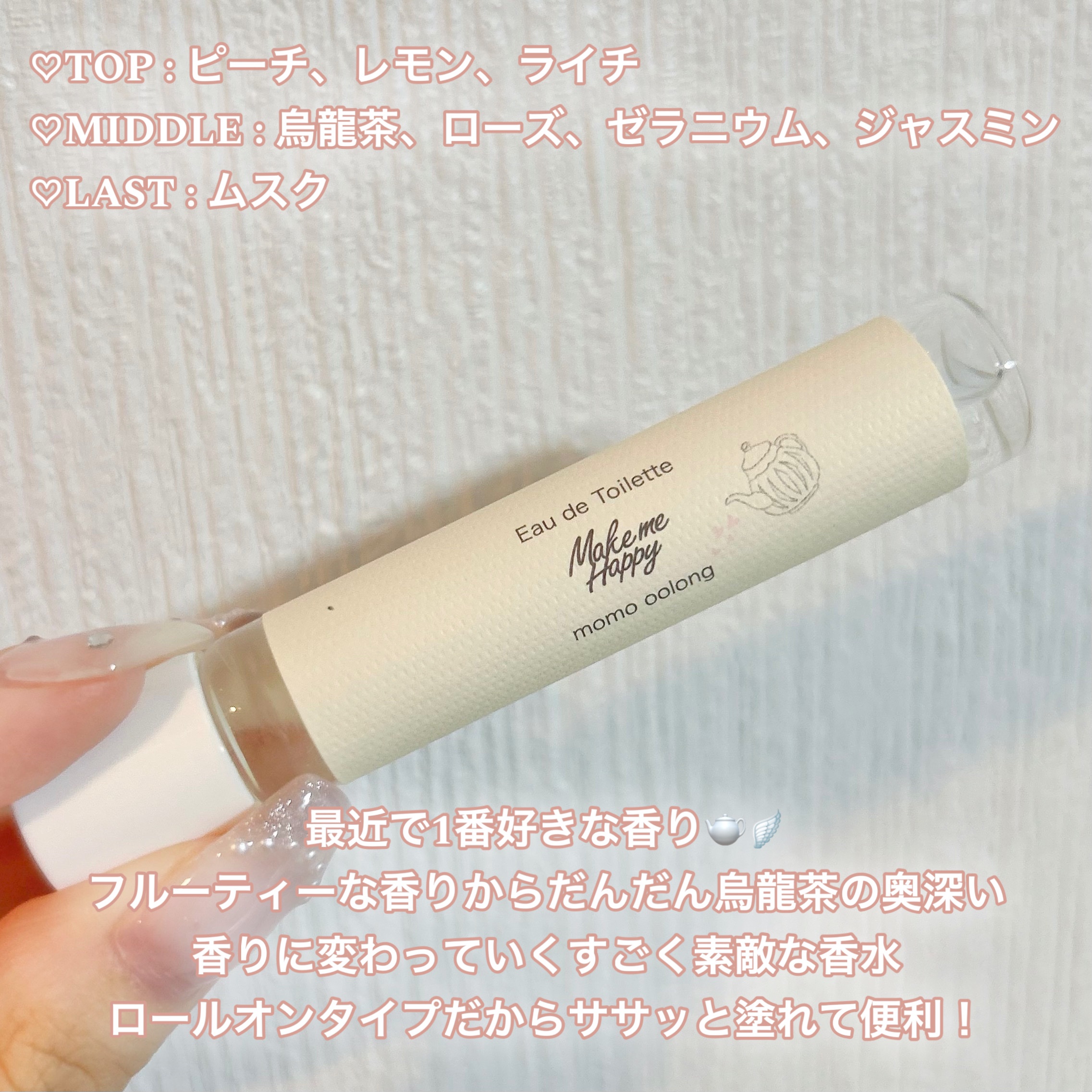 - 2024年8月下旬限定発売→2024年12月下旬以降順次定番化 つける量を調整しやすいロールオンタイプのオードトワレ。 持ち運びにも便利なサイズです。 サトウキビ由来の植物性アルコールを使用。 momo oolong(ももウーロン) 白桃烏龍茶の香り TOP:ピーチ、レモン、ライチ MIDDLE:烏龍茶、ローズ、ゼラニウム、ジャスミン LAST:ムスク