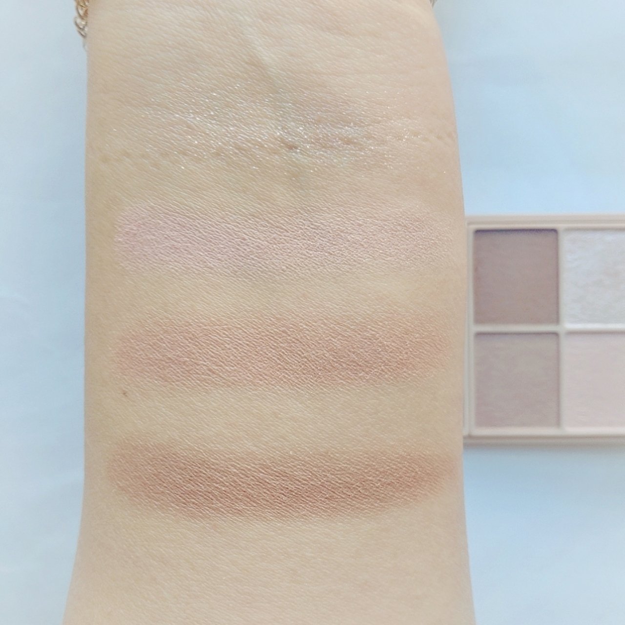 プチプラのクオリティじゃないっ!! 発売前からチェックしていたけれど、ここまで可愛いとは…😆 絶妙カラーで目もとのくすみを飛ばして*明るい印象に🩷 横割りグラデーションでメイクし、立体感をより出したかったので最後に1番左のカラーを上まぶたの真ん中と涙袋にのせています🙆 肌馴染みも良くて粉飛びも感じにくかったです💕 ブラウンの方も店頭に出てたら買おうかな💓