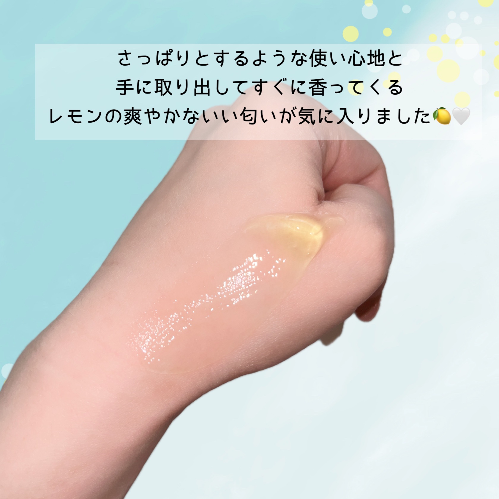 美容成分99.5%配合し、ビタミンC誘導体やCICAも配合しているのでみずみずしく手肌がうるおう仕様になっています。 オイルフリーで水分が浸透しやすい設計になっているので、角質層にすーっと浸透し、うるおいながらもべたつかない使用感なんです。 こころが落ち着くようなレモンの香りもほんのり感じられるので大好きになりました💓