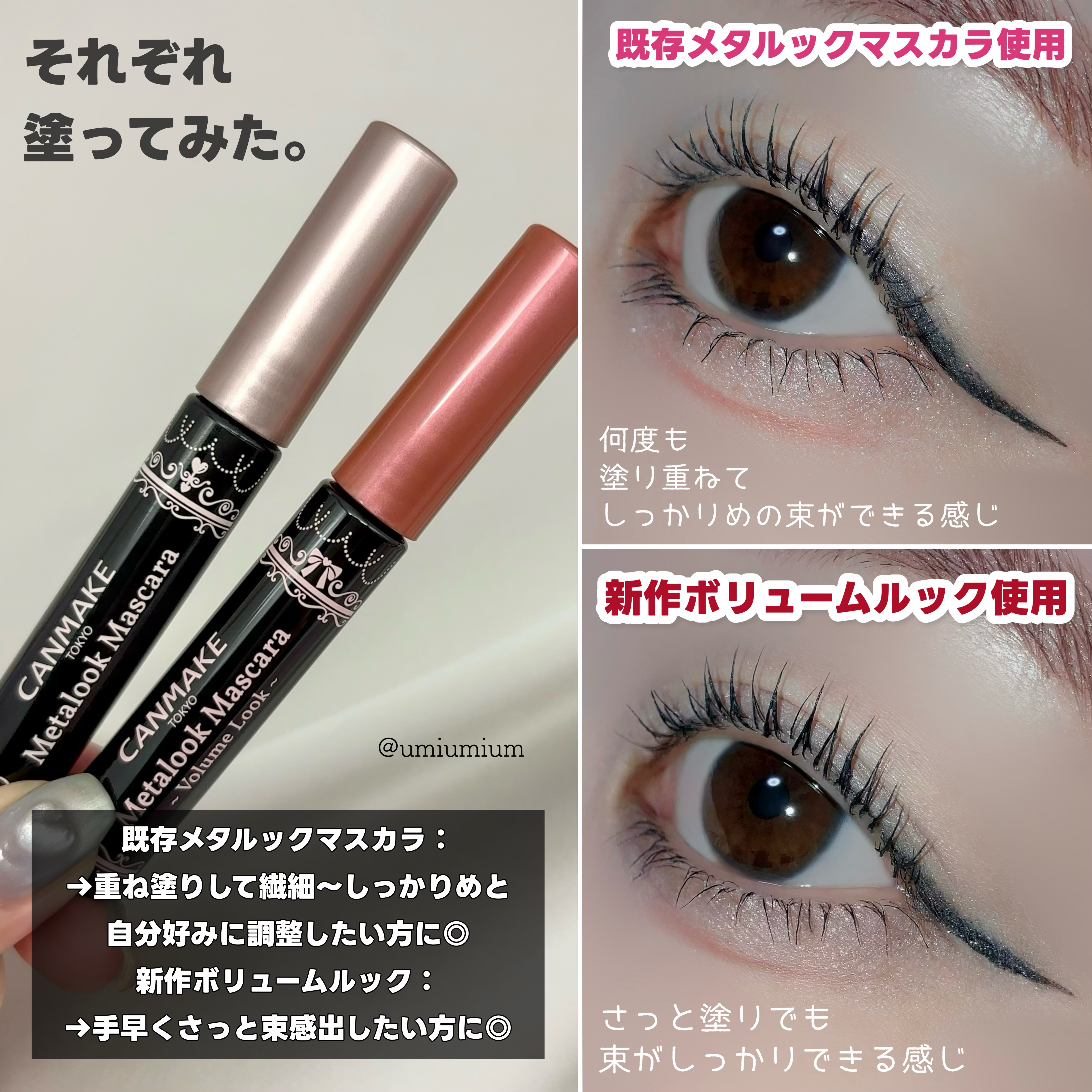 大人気のCANMAKE束感マスカラからボリュームタイプが新登場❗️ 1束1束、存在感のある束感まつげが作れるよ! 通常のメタルックマスカラも持っているけど、ボリュームタイプはゴージャスなバサバサまつげに仕上がるよ✨ 水・汗・皮脂に強い処方だから、にじみにくかったよ!