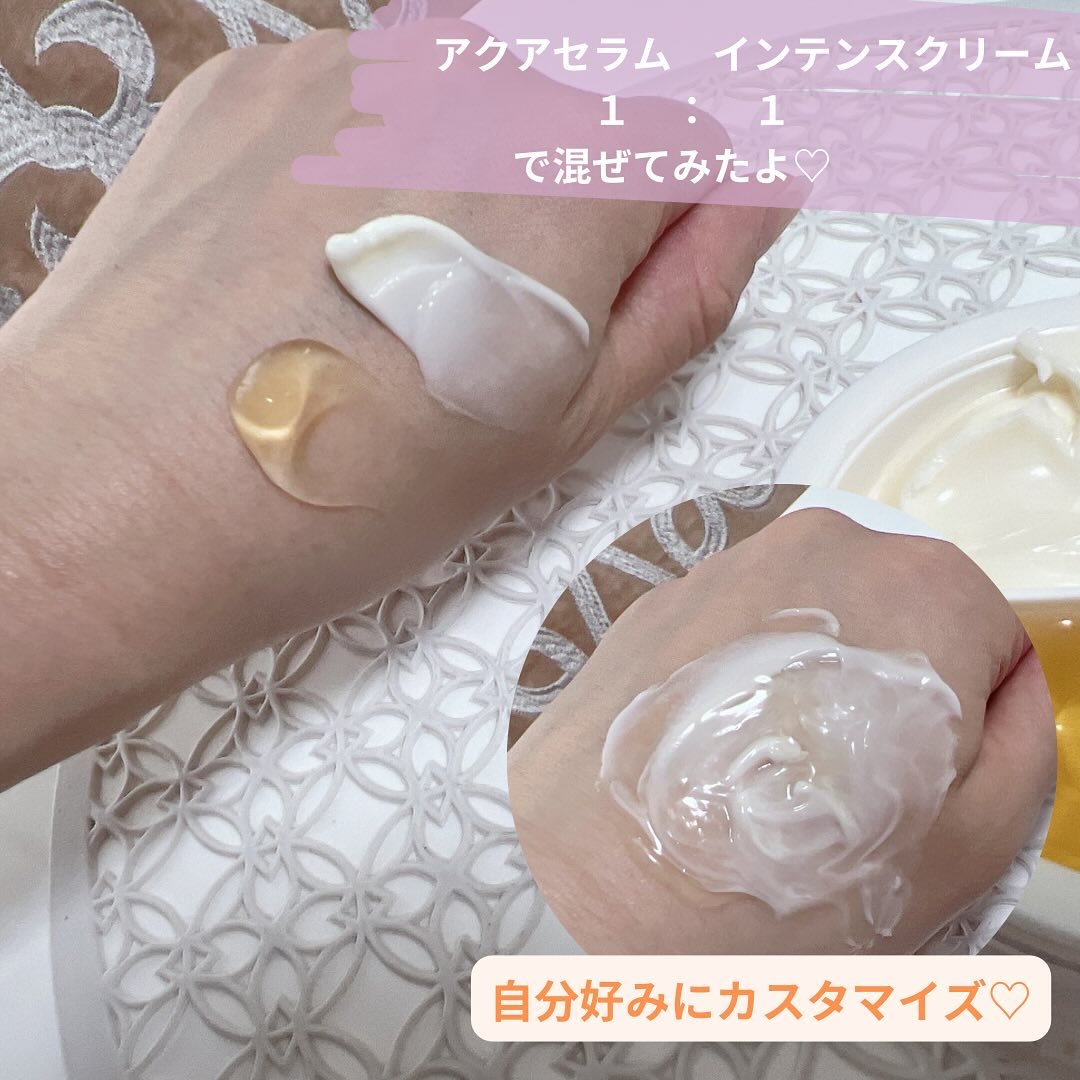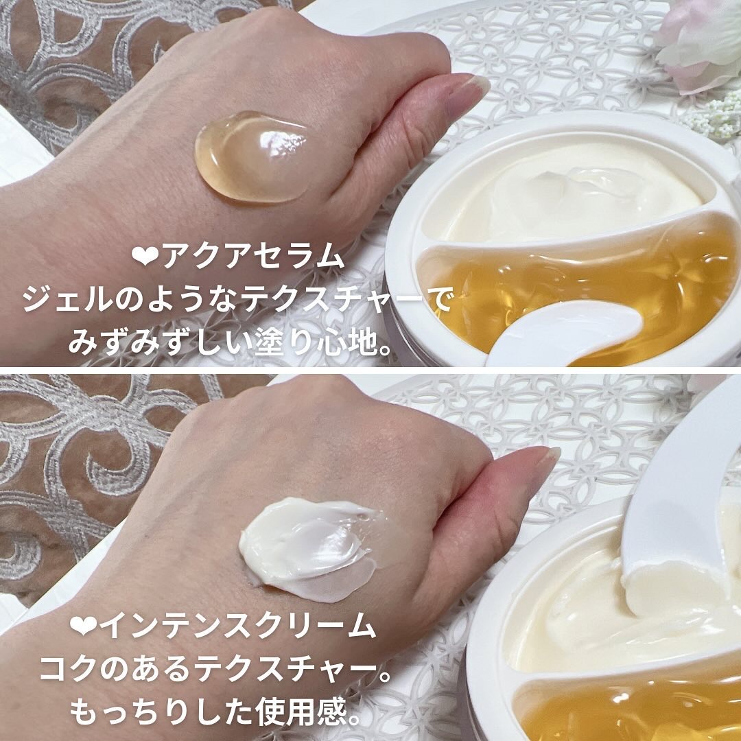 肌に水分をたっぷり与えてくれる黄色のアクアセラム×肌の弾力をしっかりサポートしてくれる白色のインテンスクリームをその日のコンディションによってミックス💕 プルプルみずみずしく軽やかな感触のアクアセラムは伸びの良いジェル状🌟 インテンスクリームはコクのあるリッチなクリームチーズの様なテクスチャー✨️ ベタつかずピタッと肌にフィットする様な使用感も好きだし、カスタマイズできる事で毎日ちゃんとお肌の状態に向き合うきっかけになりそう🌿