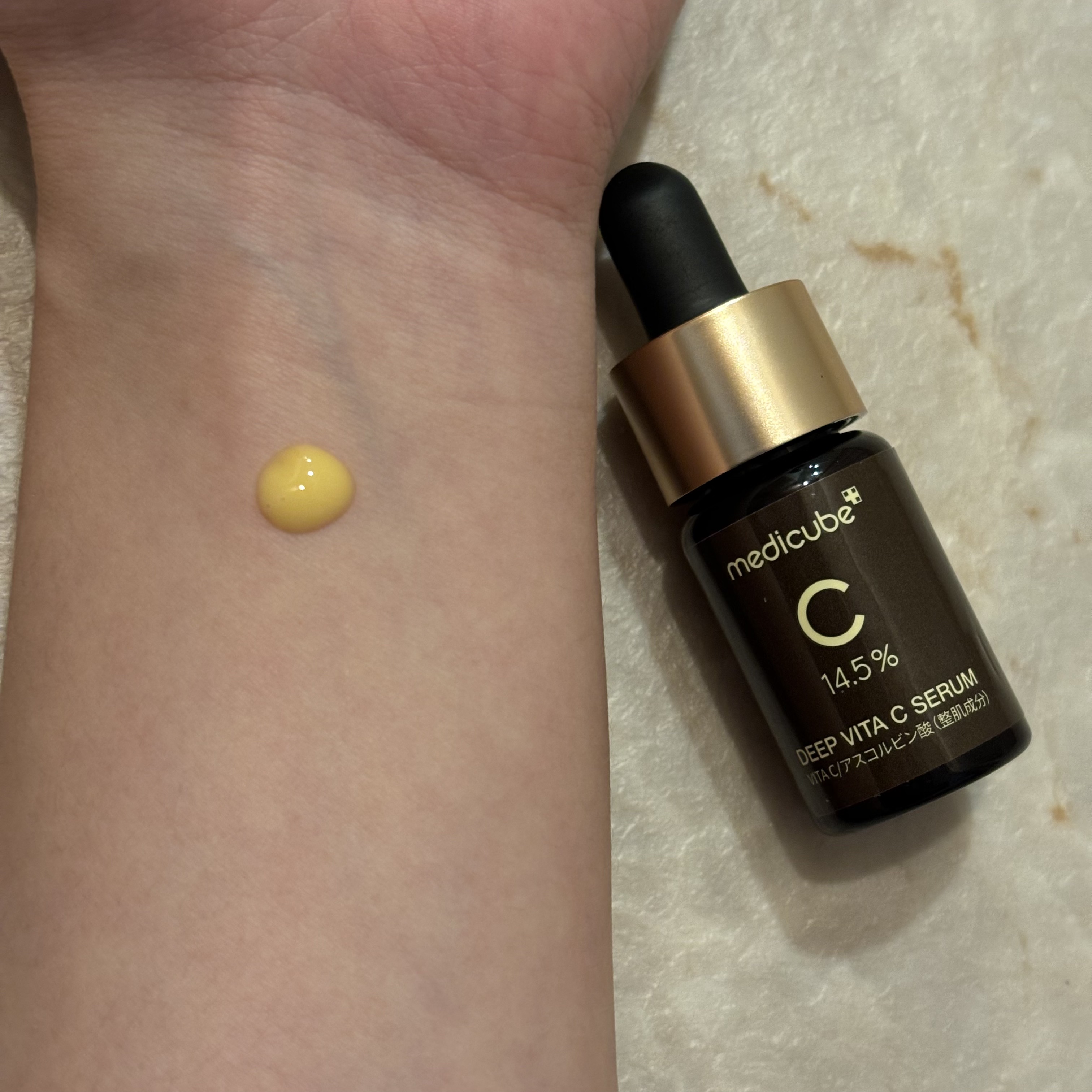 韓国🇰🇷ダーマコスメブランドの[medicube(メディキューブ)]のシミ消しケア。累計100万個販売突破の人気のアイテム! 7日間で肌がトーンアップすることが臨床試験で確認され、美白としわ改善もケアできる美容液✨ とにかく濃い! トロッと濃厚なのがわかります 高濃度ビタミンの証、独特の香りがします