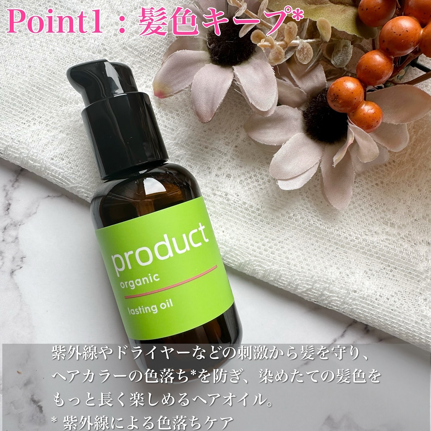 カラーの色落ち*1防いでくれる機能が嬉しいヘアオイルだよ♩ 甘酸っぱいオレンジアイスティーの香りが好き ウェットな仕上がりなのにベタつきにくいのが嬉しいテクスチャー、湿気で広がりやすい私の好み