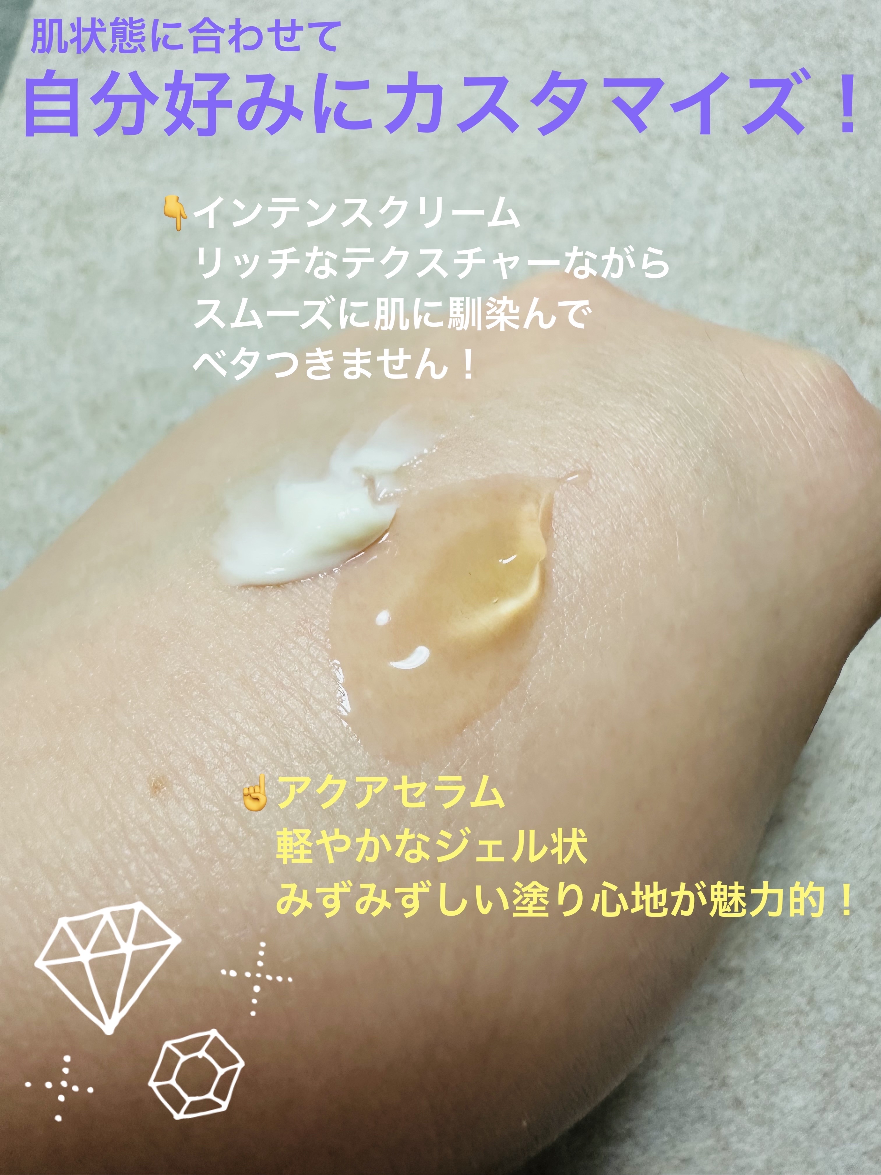 肌のコンディション/タイプに合わせてカスタムケア🍀 《アクアセラム》肌を水分チャージしながらやさしく整えて肌を落ち着かせる セラムとクリームをその日のお肌の状態に合わせてカスタマイズケアできる魅力的アイテム☺️🤍 肌タイプ問わず使いやすいし使い心地も良かった。 翌日もお肌に弾力と保湿を感じられたよ!