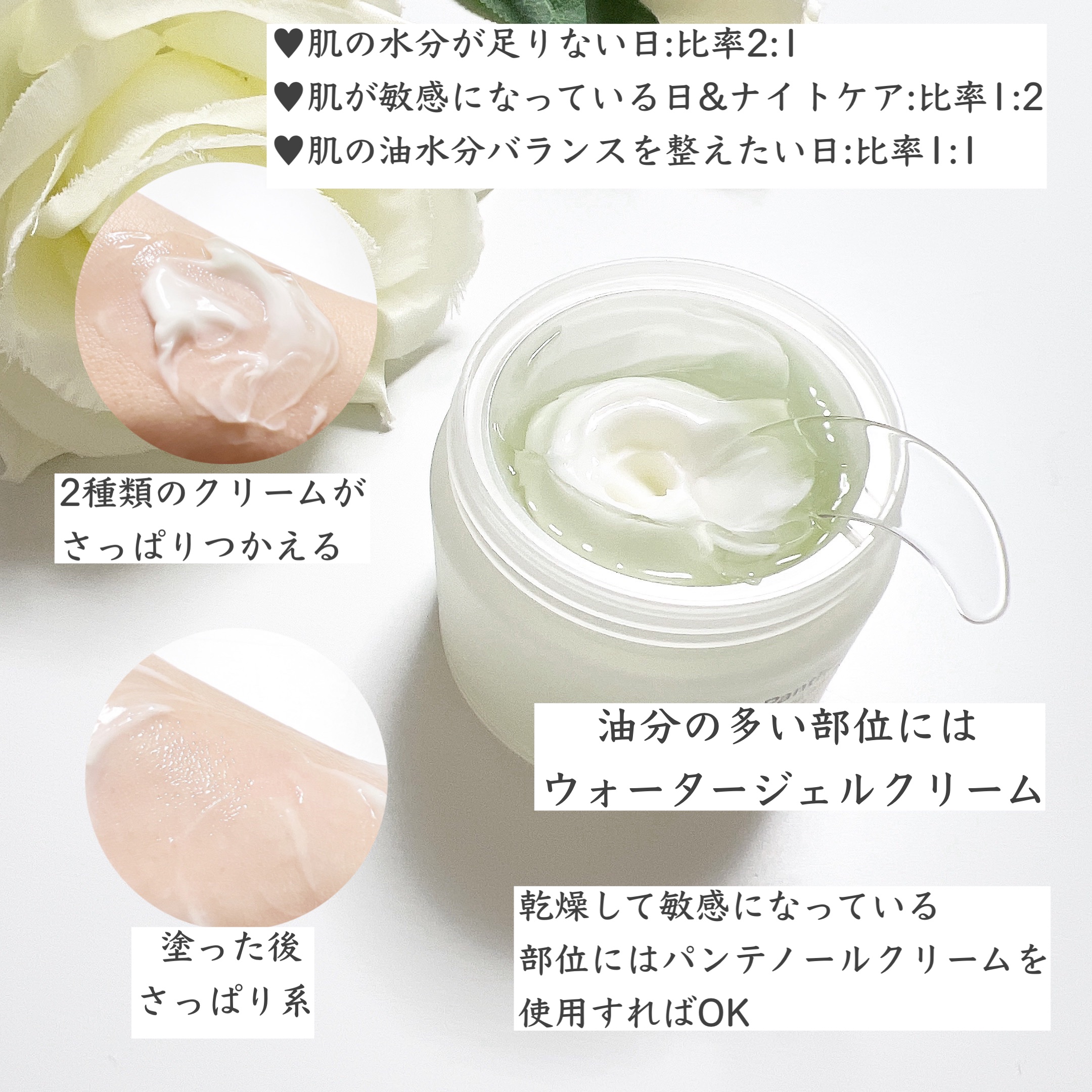 - 毎日変わる肌のコンディションに合わせて自分だけの肌レシピを作れるカスタマイズクリーム うるおいたっぷりのウォータージェルクリームと水分補給&生き生きとした肌印象に導くパンテノールクリームで同時にダブルケアができるこだわりアイテム。 べたつきなく柔らかいテクスチャーの2つのクリームが肌のコンディションを整え、もちっとハリ感のある肌へと導きます。 [使い方] 1)洗顔後、化粧水や美容液で肌を整えた後に、スパチュラで肌のコンディションによって、ウォータージェルクリームとパンテノールクリームを適量を取り、 混ぜ合わせてから顔全体に優しく塗り伸ばします。 *毎日変わる肌のコンディションに合わせて、乾燥が気になる時はウォータージェルクリームを、敏感に傾いた肌を整えたい時にはパンテノールクリームの量を多めにMIXして使用するのがおすすめです。