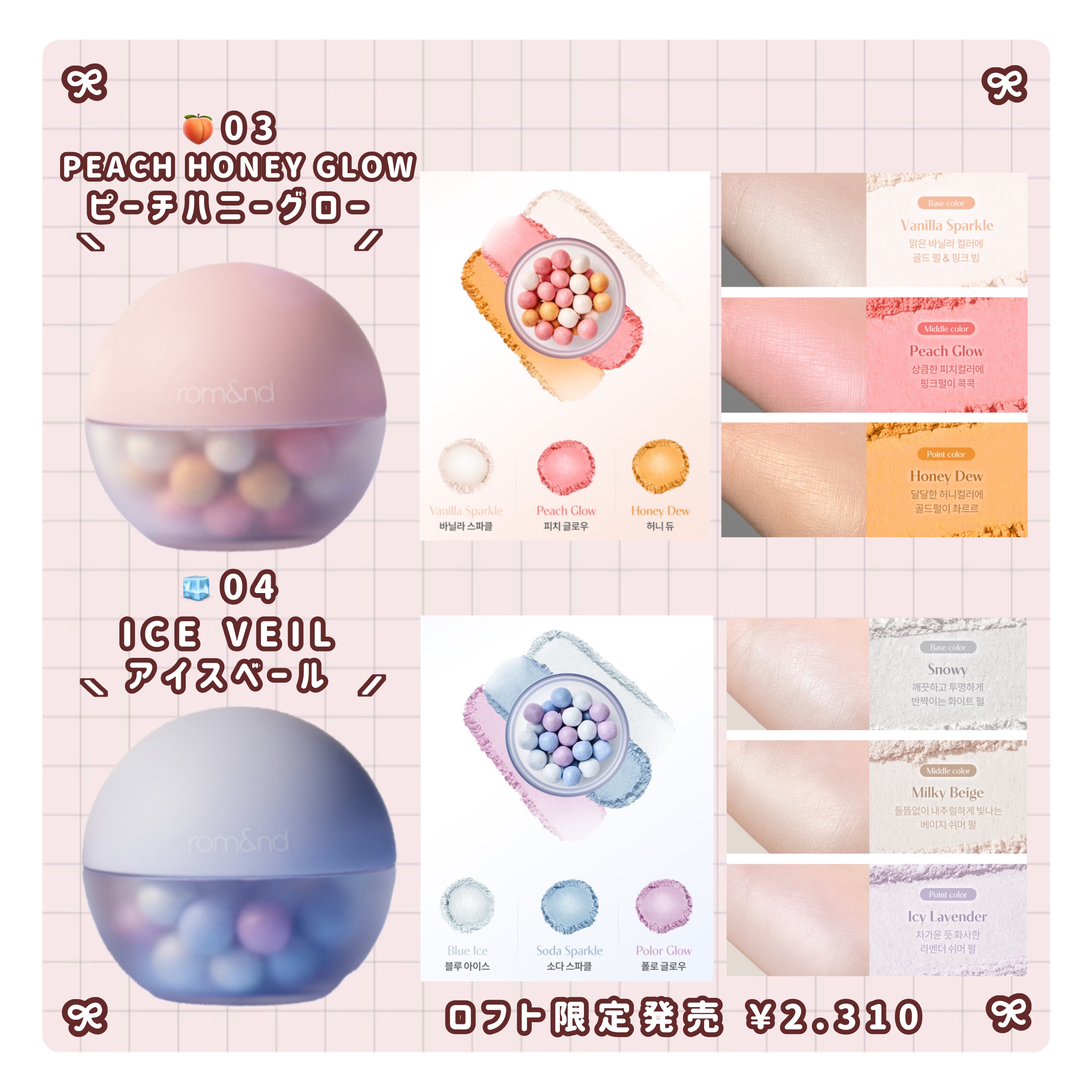 - <01 グリーミーベール(Gleamy Veil)> ①スノーウィー 合成フルオロフロゴパイト、マイカ、ホウケイ酸(Ca/チタン)、オクテニルコハク酸デンプンAl、酸化チタン、セルロース、リンゴ酸ジイソステアリル、ヘクトライト、エチルヘキサン酸セチル、エチルヘキシルグリセリン、カプリリルグリコール、1,2-ヘキサンジオール、酸化スズ、香料 ②ミルキーベージュ マイカ、オクテニルコハク酸デンプンAl、アルミナ、合成フルオロフロゴパイト、セルロース、酸化チタン、ヘクトライト、リンゴ酸ジイソステアリル、エチルヘキサン酸セチル、エチルヘキシルグリセリン、カプリリルグリコール、1,2-ヘキサンジオール、酸化スズ、香料、酸化鉄 ③アイシーラベンダー マイカ、合成フルオロフロゴパイト、オクテニルコハク酸デンプンAl、酸化チタン、セルロース、ホウケイ酸(Ca/チタン)、グンジョウ、ヘクトライト、リンゴ酸ジイソステアリル、エチルヘキサン酸セチル、エチルヘキシルグリセリン、カプリリルグリコール、1,2-ヘキサンジオール、酸化スズ、香料、赤226 <02 ベリーグロー(BERRY GLOW)> ①ベアシュガー マイカ、オクテニルコハク酸デンプンAl、ホウケイ酸(Ca/Al)、酸化チタン、セルロース、ホウケイ酸(Ca/チタン)、合成フルオロフロゴパイト、リンゴ酸ジイソステアリル、ヘクトライト、エチルヘキサン酸セチル、1,2-ヘキサンジオール、カプリリルグリコール、エチルヘキシルグリセリン、酸化スズ、香料、酸化鉄、赤226 ②ヒーターピンク マイカ、合成フルオロフロゴパイト、酸化チタン、オクテニルコハク酸デンプンAl、セルロース、ホウケイ酸(Ca/Al)、リンゴ酸ジイソステアリル、ヘクトライト、エチルヘキサン酸セチル、エチルヘキシルグリセリン、赤226、カプリリルグリコール、1,2-ヘキサンジオール、酸化スズ、香料、グンジョウ、酸化鉄 ③ロジーベリー オクテニルコハク酸デンプンAl、合成フルオロフロゴパイト、マイカ、酸化チタン、セルロース、赤226、ヘクトライト、リンゴ酸ジイソステアリル、エチルヘキサン酸セチル、1,2-ヘキサンジオール、カプリリルグリコール、エチルヘキシルグリセリン、香料、酸化スズ、グンジョウオクテニルコハク酸デンプンAl、合成フルオロフロゴパイト、マイカ、酸化チタン、セルロース、赤226、ヘクトライト、リンゴ酸ジイソステアリル、エチルヘキサン酸セチル、1,2-ヘキサンジオール、カプリリルグリコール、エチルヘキシルグリセリン、香料、酸化スズ、グンジョウ <03 ピーチハニーグロー(PEACH HONEY GLOW)> オクテニルコハク酸デンプンAl、マイカ、ホウケイ酸(Ca/Al)、セルロース、アルミナ、ポリメタクリル酸メチル、(HDI/トリメチロールヘキシルラクトン)クロスポリマー、酸化チタン、リンゴ酸ジイソステアリル、1,2-ヘキサンジオール、シリカ、ヘクトライト、エチルヘキサン酸セチル、エチルヘキシルグリセリン、酸化鉄、酸化スズ、香料、合成フルオロフロゴパイト、オクテニルコハク酸デンプンAl、酸化チタン、マイカ、セルロース、ポリメタクリル酸メチル、(HDI/トリメチロールヘキシルラクトン)クロスポリマー、酸化鉄、リンゴ酸ジイソステアリル、1,2-ヘキサンジオール、ヘクトライト、エチルヘキサン酸セチル、エチルヘキシルグリセリン、赤228、酸化スズ、香料、シリカ、オクテニルコハク酸デンプンAl、マイカ、合成フルオロフロゴパイト、酸化チタン、セルロース、ポリメタクリル酸メチル、(HDI/トリメチロールヘキシルラクトン)クロスポリマー、赤226、リンゴ酸ジイソステアリル、1,2-ヘキサンジオール、ヘクトライト、エチルヘキサン酸セチル、赤228、エチルヘキシルグリセリン、香料、酸化スズ、シリカ、酸化鉄 <04 アイスベール(ICE VEIL)> オクテニルコハク酸デンプンAl、ホウケイ酸(Ca/Al)、マイカ、酸化チタン、合成フルオロフロゴパイト、セルロース、ポリメタクリル酸メチル、(HDI/トリメチロールヘキシルラクトン)クロスポリマー、グンジョウ、リンゴ酸ジイソステアリル、1,2-ヘキサンジオール、赤226、ヘクトライト、エチルヘキサン酸セチル、エチルヘキシルグリセリン、酸化スズ、香料、シリカ、オクテニルコハク酸デンプンAl、マイカ、ホウケイ酸(Ca/Al)、酸化チタン、セルロース、ポリメタクリル酸メチル、(HDI/トリメチロールヘキシルラクトン)クロスポリマー、リンゴ酸ジイソステアリル、1,2-ヘキサンジオール、ヘクトライト、グンジョウ、エチルヘキサン酸セチル、エチルヘキシルグリセリン、酸化スズ、シリカ、酸化鉄、香料、オクテニルコハク酸デンプンAl、マイカ、合成フルオロフロゴパイト、酸化チタン、ホウケイ酸(Ca/Al)、セルロース、グンジョウ、ポリメタクリル酸メチル、(HDI/トリメチロールヘキシルラクトン)クロスポリマー、リンゴ酸ジイソステアリル、1,2-ヘキサンジオール、ヘクトライト、エチルヘキサン酸セチル、エチルヘキシルグリセリン、酸化鉄、香料、酸化スズ、シリカ