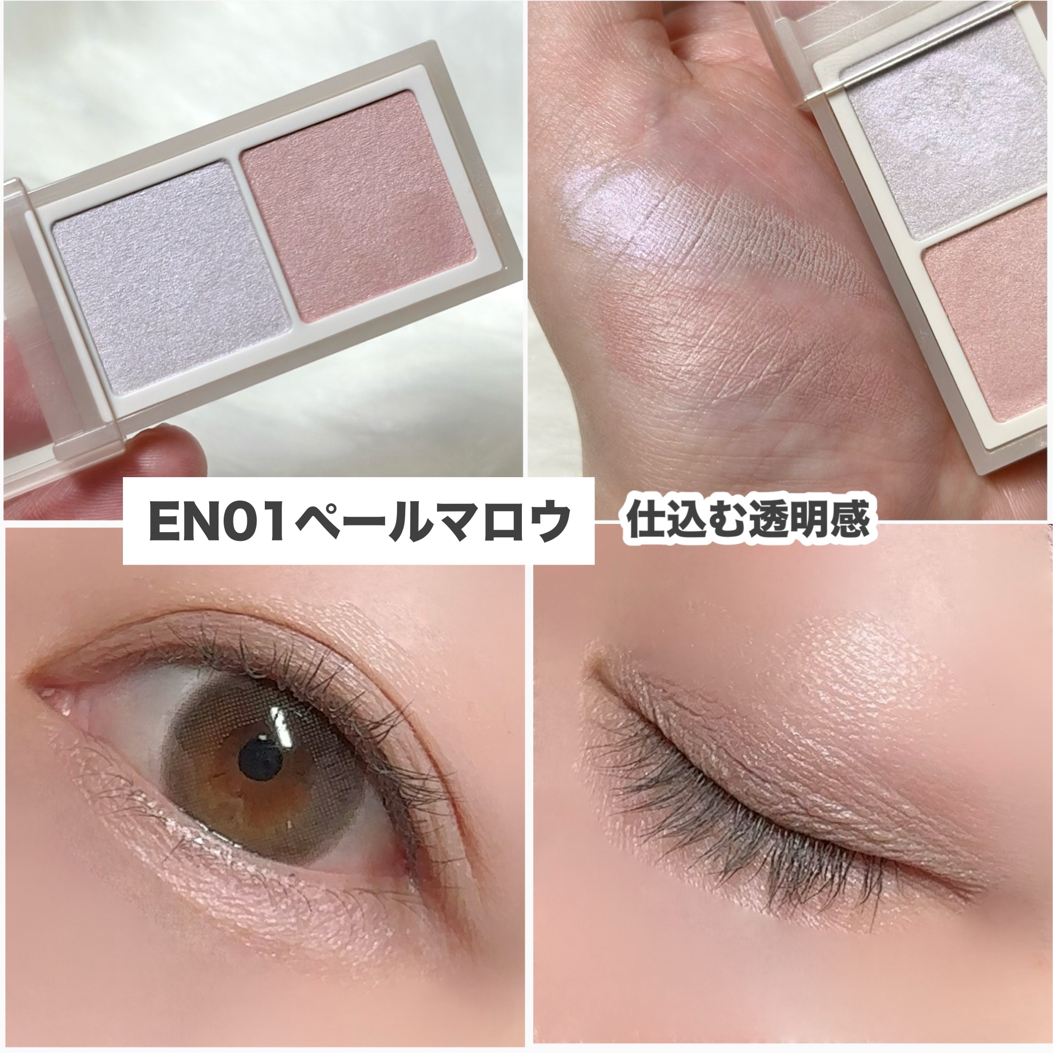 - [PERFORMANCE] 絶妙2トーンカラーで目元に軽やかな彩りを添えるまろやか発色の“引き算メイク”アイシャドウ [QUALITY] 1.素材の美しさを引き出すニュアンスミュートカラー 質感の異なる2色が重なり合い表情をやわらかに彩る 2.まぶたに溶け込むように馴染むソフトマットな水彩発色 テクニック要らずでラフに重ねて立体感をプラス 3.リッチな質感の密着パウダー処方で粉飛びしにくい 4.スクワラン(保湿)配合で目元の乾燥を防ぐ [DESIGN] ・片手で開いてさっと塗れるスライド式容器 ・スリムでコンパクトだからポーチの中でかさばらない ★なりたい印象に合わせて選べる3 色★ EN01 ペールマロウ 透明感ライラックでやさしく儚げな印象に EN02 ファジーコットン 陰影ベージュカラーで奥深い落ち着いた印象に EN03 サイレントポピー 血色ピンクカラーでピュアな可愛らしい印象に 10月15日(火)~エクセル公式オンラインショップ、アマゾンにて先行発売