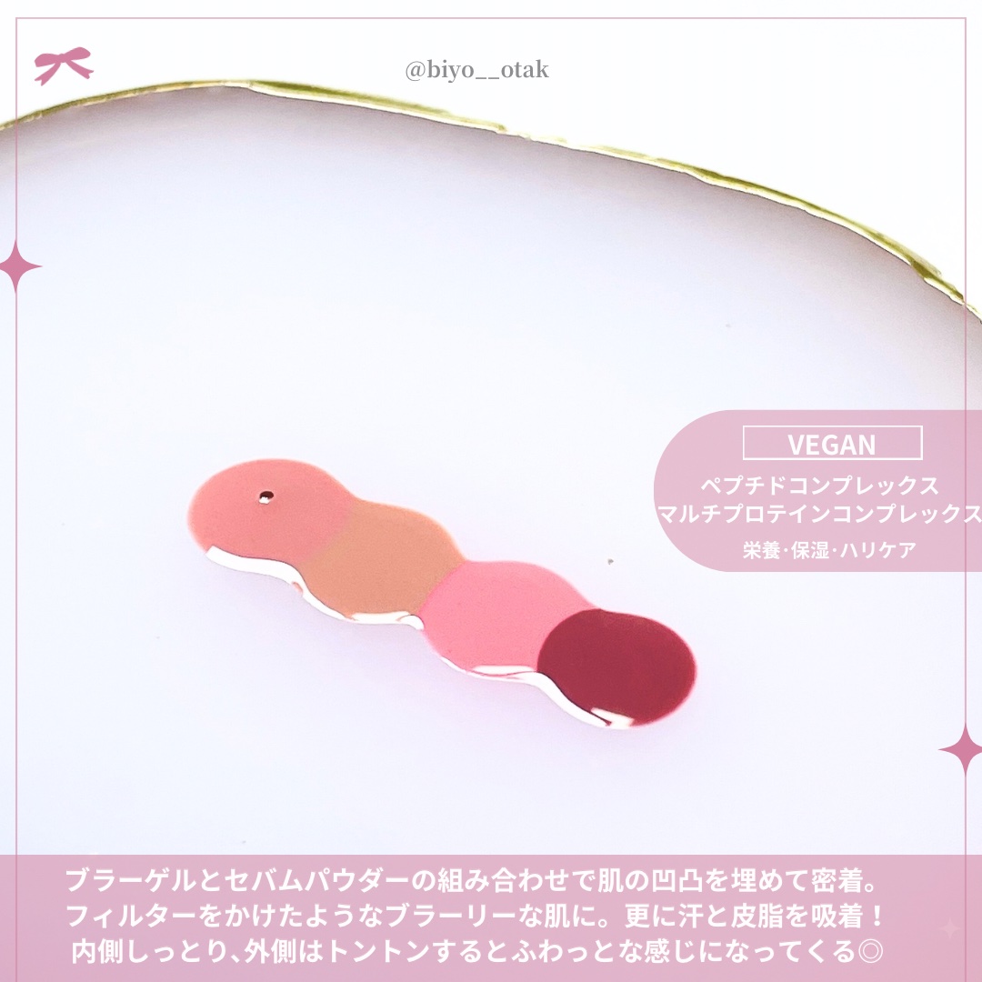 肌に自然と馴染む血色カラーが勢揃い... !! トーンにやさし〜く馴染んでくれるよ🫶🏻 しかも仕上がりがまじやばい!トントンっと馴染ませると外側サラッとなのに内側しっとり! ブラーゲルとセバムパウダーの組み合わせで凹凸を埋めて密着、チークなのにお肌を綺麗に見せてくれるの!