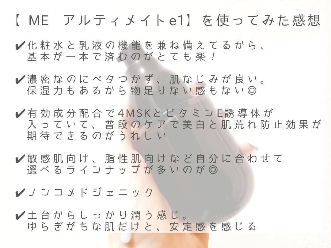 化粧液ME アルティメイトe1 16種類の中から自分に合った化粧液をおすすめしてくれるME 化粧液のテクスチャーはとろみがあるのにベタつき感がなく伸びが良いです‼︎ 忙しい日は洗顔後これ一本でも大丈夫だそうでクリームが嫌いだったり忙しい人などにはもっとおすすめかなと思います🤍