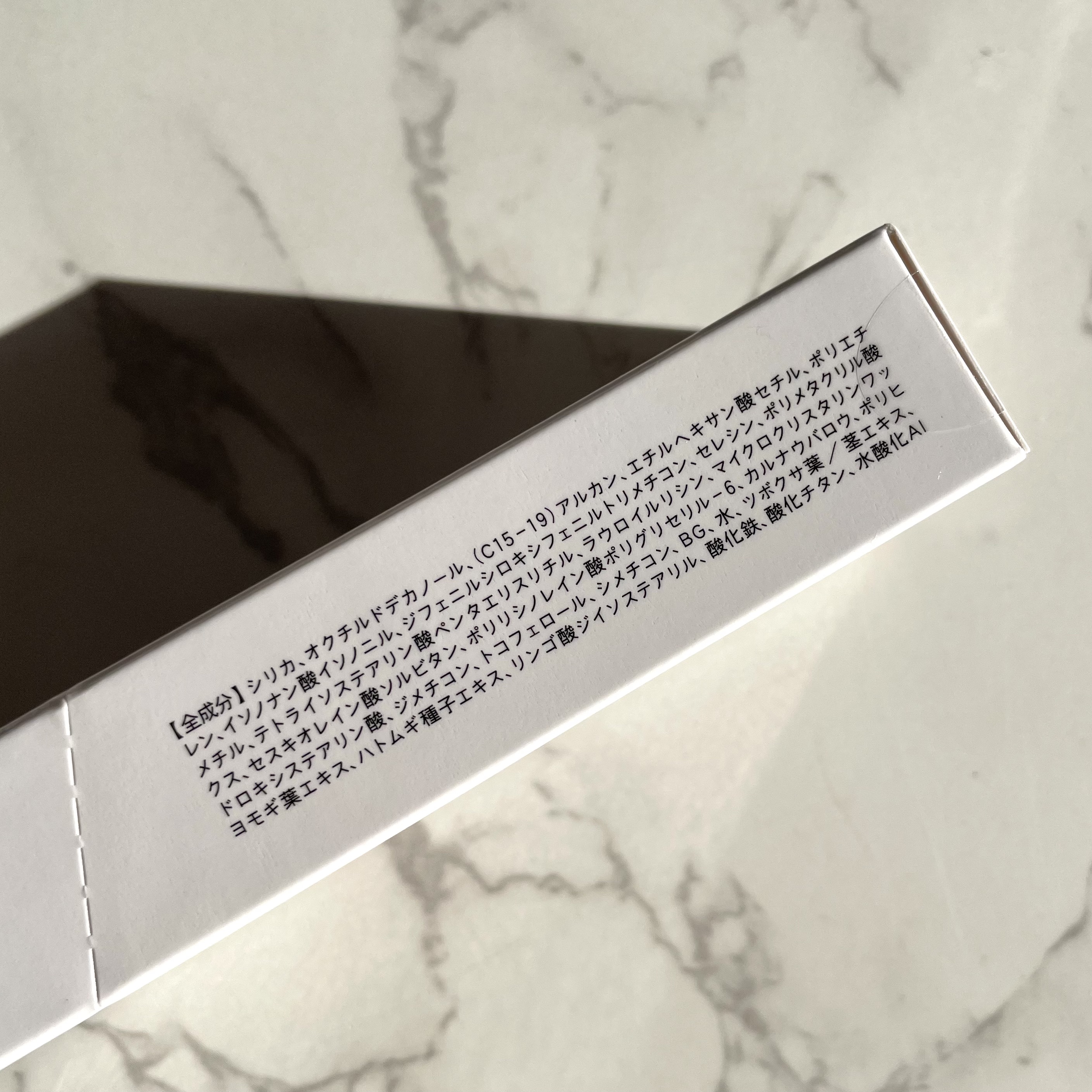 - シリカ、オクチルドデカノール、(C15-19)アルカン、エチルヘキサン酸セチル、ポリエチレン、イソノナン酸イソノニル、ジフェニルシロキシフェニルトリメチコン、セレシン、ポリメタクリル酸メチル、テトライソステアリン酸ペンタエリチル、ラウロイルリシン、マイクロクリスタリンワックス、セスキオレイン酸ソルビタン、ポリリシノレイン酸ポリグリセリルー6、カルナウバロウ、ポリヒドロキシステアリン酸、ジメチコン、トコフェロール、シメチコン、BG、水、ツボクサ葉/茎エキス、ヨモギ葉エキス、ハトムギ種子エキス、リンゴ酸ジノソステアリル、酸化鉄、酸化チタン、水酸化Al
