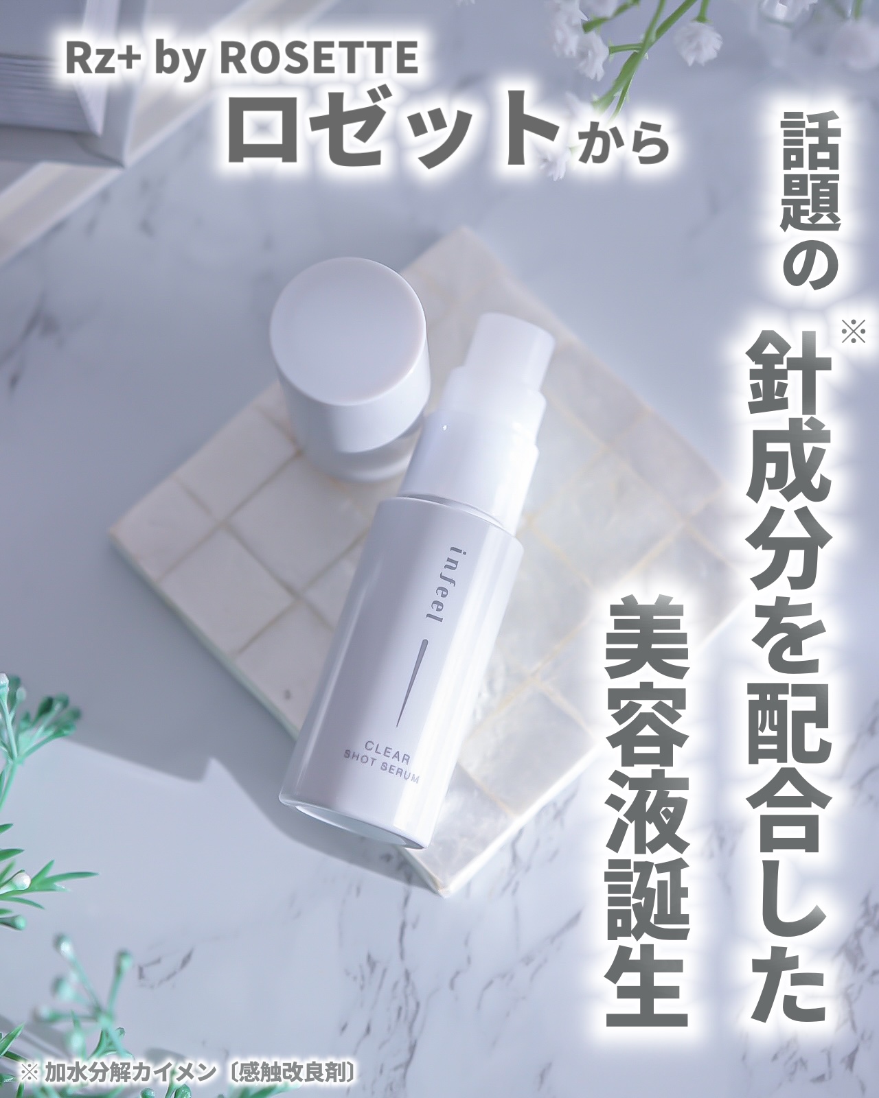 - ■「大」「小」の針*1で保水&高浸透*4を促す“ダブルデリバリー処方” 長さの異なる「大」「小」の針*1を組み合わせることで、肌への浸透*4をサポート。肌悩みに合わせた美容成分*2を多角的*3に届けながら*4、うるおいを与えます。 *1 加水分解カイメン[感触改良剤] *2 保湿成分 *3 美容液、針による *4 角層まで ■チクチク感控えめ*6を実現する“ニードル*1クッション処方” 保護膜となるクッションベールを形成して、針*1をやさしく包み込み、塗布時のチクチク感を軽減する*6独自処方を採用。マイルドな針感*6で、チクチク感の苦手な方でも使いやすいよう使用感にこだわりました。 *1 加水分解カイメン[感触改良剤] *6 針感の感じ方には個人差があります ■infeel クリアショットセラム 約600,000本(1製品あたり)の大小ニードル*1を配合した透明感*9にアプローチする針*1美容液。みずみずしく広がる美容液で、透き通るようなクリアな肌印象に。使いやすいマイルドな針感です*6。 *1 加水分解カイメン[感触改良剤] *6 針感の感じ方には個人差があります *9 うるおいによる肌印象 ●透明感*9にアプローチする美容成分×ビタミン 速攻・安定型ビタミンC*7/グルタチオン*2/ナイアシンアミド*8/アゼライン酸*2/CICA*10/浸透型*4ヒアルロン酸*11 *2 保湿成分 *4 角層まで *7 アスコルビン酸、アスコルビルグルコシド[製品の抗酸化剤] *8 製品の抗酸化剤 *9 うるおいによる肌印象 *10 ツボクサエキス[保湿成分] *11 加水分解ヒアルロン酸Na[保湿成分] ●肌表面のうるおいバランスを整えるセラミド*12ブースター *12 セラミドNP[保湿成分] パッケージデザイン 商品特長である針のモチーフをあしらったデザイン。針をイメージした三角柱の化粧箱もポイントです。 ■先行発売日:2024年10月7日(月) ※ロゼット公式オンラインショップにて先行発売 ■一般発売日:2024年10月28日(月) ※10/28はメーカー出荷日のため、店頭での展開開始日は店舗の状況により異なります。 ■流通:全国のバラエティショップ(※一部店舗を除く)ロゼットの各公式オンラインショップにて発売予定 【ロゼットオンラインショップ】https://rosette.jp/