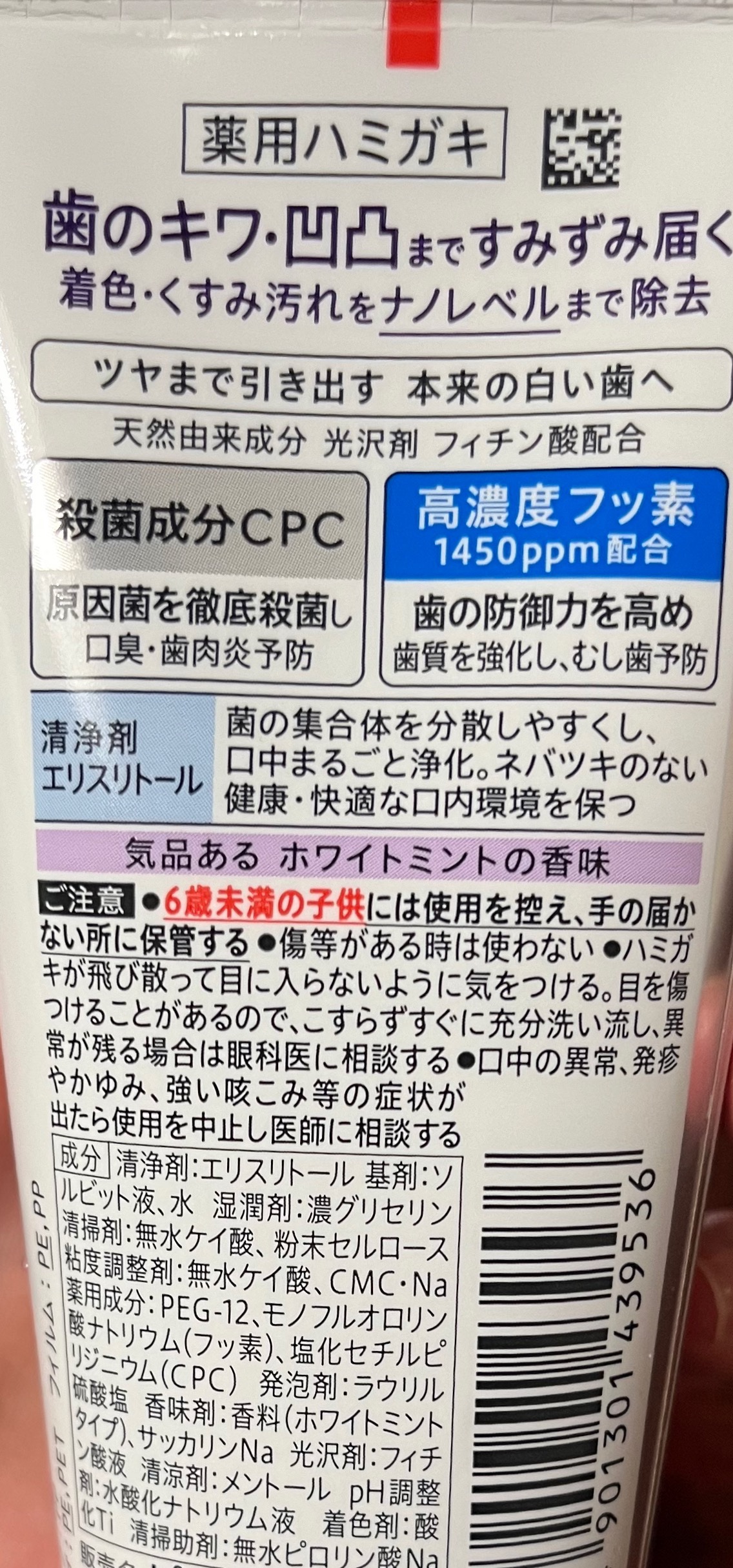 - 【医薬部外品】 歯のキワ・凹凸まですみずみ届く 美白ケア。 歯のくすみ汚れ(沈着・着色汚れ)をナノレベルまで除去。 ツヤまで引き出し、本来の白い歯へ。天然由来の光沢剤フィチン酸配合。高濃度フッ素1450ppm配合。 殺菌成分CPC(塩化セチルピリジニウム)が原因菌を殺菌、口臭・歯肉炎・むし歯予防。 清浄剤エリスリトールが菌の塊(菌を含む口内の汚れ)に素早く浸透、分散しやすくし口中浄化。快適で健やかな口内環境を保つ。 気品あるホワイトミントの香味 *6歳未満の子供には使用を控え、手の届かない所に保管する