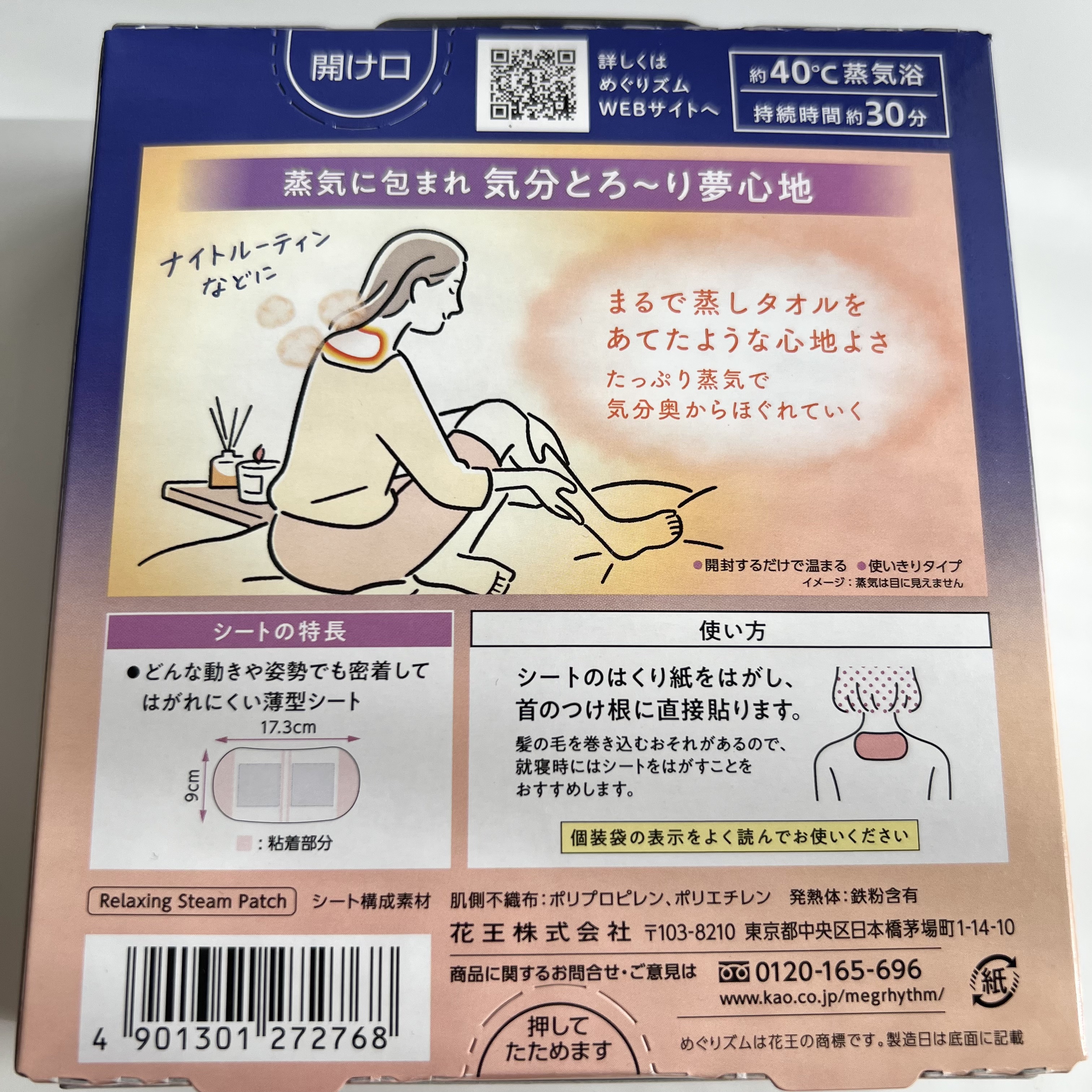 - ※パッケージが変わりました。 ぬくもりを心地よく感じる首もとに、約40℃・約30分の蒸気浴。カチコチ気分の時も、たっぷりの蒸気が首もとを温かく包み込み、とろ~りリラックス気分に誘います。まるで蒸しタオルをあてたような心地よさ。 開封するだけで温まるので、いつでもどこでも、すぐに使えて便利。おやすみ前、自宅でくつろぐ時、飛行機などでの移動時のリラックスにも使用出来ます。 無香料。