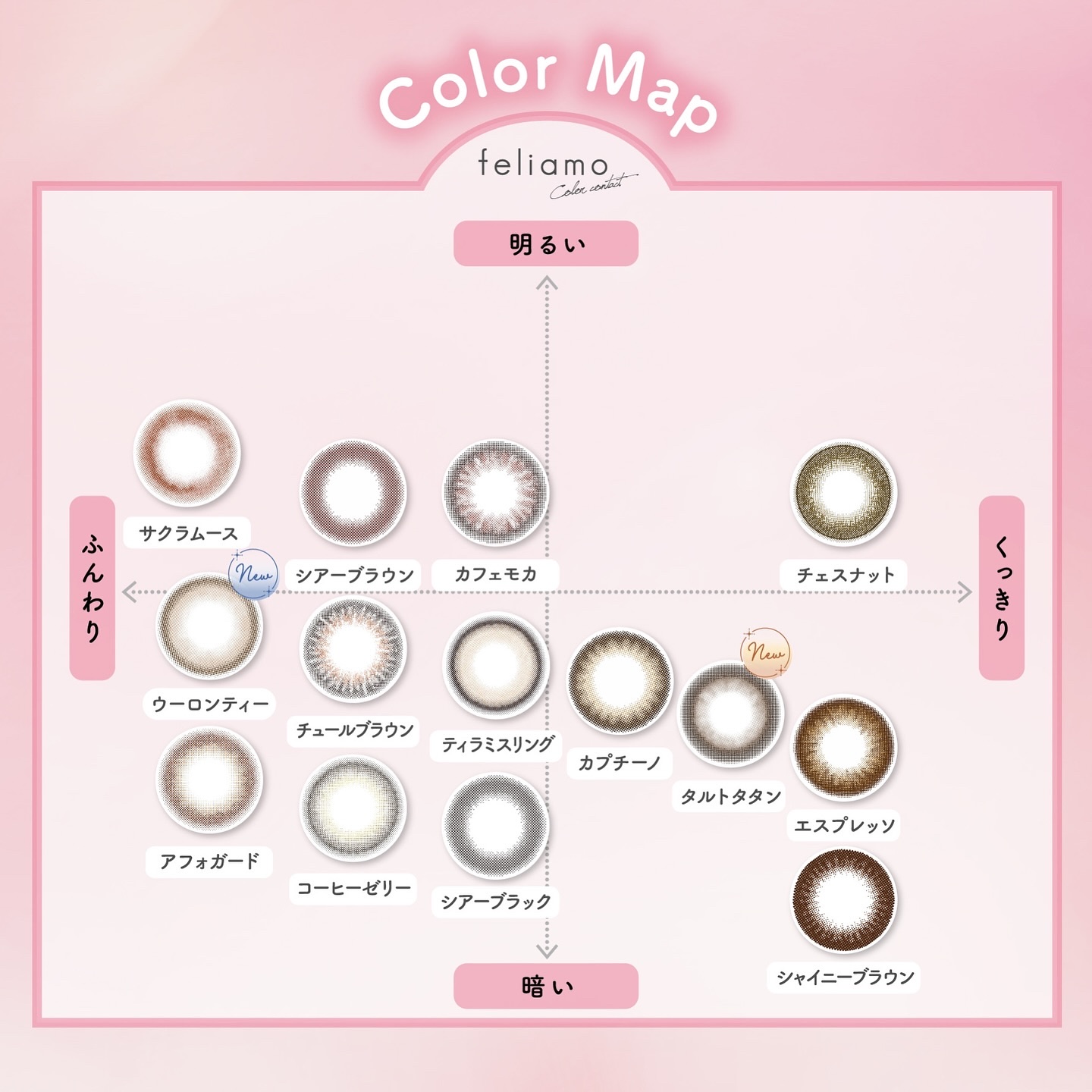 - ※2025年6月以降、商品パッケージ裏面・側面の一部表記を順次変更いたします。尚、これにかかる商品の交換・返品は承っておりません。 どんな瞬間にも溶け込む誰からも愛される瞳へ feliamoの由来は felice amore~幸せな愛~ 瞳から愛されオーラを放つ好印象レンズで女性らしさと品を演出。 オンも、オフも、特別な日も。 どんな場面にも溶け込むレンズラインナップで誰からも愛される瞳に。 UV CUT Feature1 肌や瞳に有害といわれ、白内障などの眼病を引き起こす危険性のある紫外線を99%カットします。(UV-A波75%、UV-B波99%カット) イオン性 Feature1 水分を多く含み酸素を通しやすいため瞳にやさしい使い心地で、快適な装用感です。 高含水 Feature1 水分が多く含むやわらかい素材で、快適なつけ心地です。 レンズ構造 Feature1 まぶた側に着色剤を内包しているため、角膜に色素が触れることがない構造を採用しています。 レンズ形状 Feature1 フチを丸みのある形状にすることで自然な装用感を実現しました。 ※装用感には個人差があります。 カラーコンタクトレンズの不適正使用による眼障害の危険性等などがあります。 ●コンタクトレンズは高度管理医療機器です。不十分な洗浄・消毒など不適切なケアや、長時間・交換期間を超えた装用により、アレルギー性結膜炎、角膜感染症、角膜潰瘍等の重篤な眼障害が発生する危険性があります ●ご使用前に取扱説明書を確認してください 使用上の留意事項 ●眼科医院等を受診してからお求めください ●眼に異常を感じたら直ちにレンズ使用を中止し、お近くの眼科等で診察を受けてください ●医師の指示にしたがってご使用ください ●コンタクトレンズを装用する場合、自覚症状がなくても、眼科医院等での定期検査を受けてください ●レンズに不具合がある場合は使用しないでください