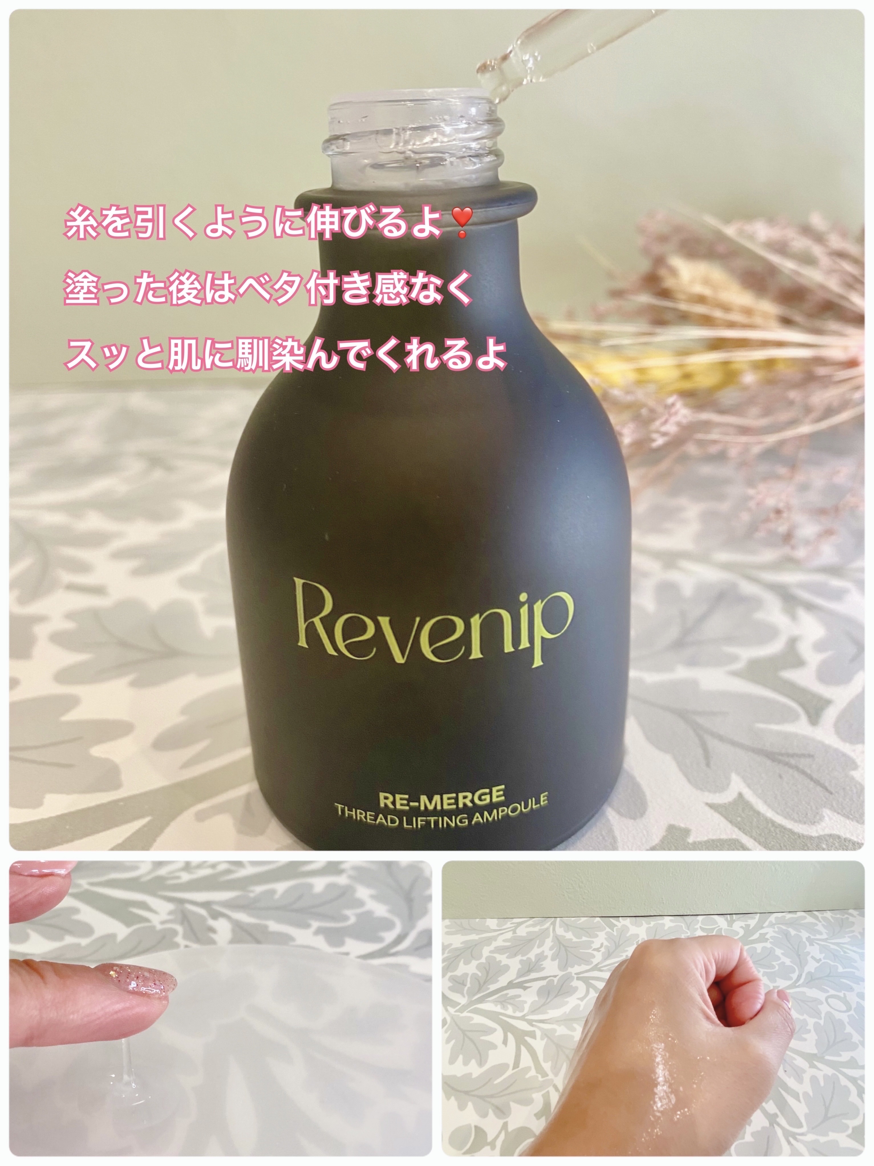 韓国の肌弾力専門ブランド REVENIP(リベニプ)様よりリマージ糸リフティングアンプルをいただきました。リベニプはQoo10へ新しく進出した韓国スキンケアブランド!「崩れない弾力ケア」で肌の黄金期を持続的に維持させるというコンセプトです。 ほのかにフローラルな香りがする透明な美容液です。そしてよくInstagramで見るように糸を引くくらいトロトロなのか……本当にとろっとろ!!とってもお肌に効きそうで魅力的です!