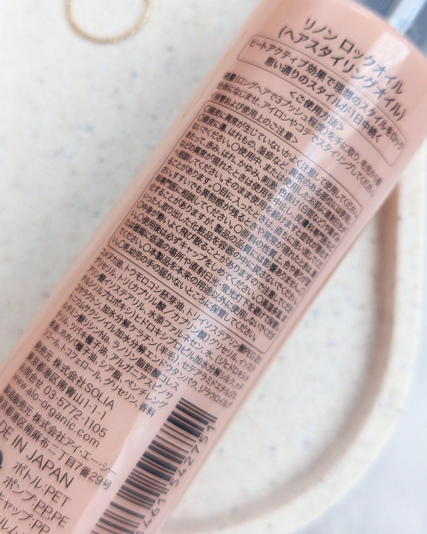- <Linon ロックオイル> コメヌカ油、トウモロコシ胚芽油、トリイソステアリン酸PEG-20グリセリル、トリ(カプリル酸/カプリン酸)グリセリル、イソステアリン酸イソステアリル、水添ファルネセン、水、(ジヒドロキシメチルシリルプロポキシ)ヒドロキシプロピル加水分解シルク、γ-ドコサラクトン、加水分解ケラチン(羊毛)、セテアラミドエチルジエトニウムサクシノイル加水分解エンドウタンパク、ジラウロイルグルタミン酸リシンNa、ラノリン脂肪酸コレステリル、ツバキ種子油、アルガニアスピノサ核油、ホホバ種子油、シア脂、ペンチレングリコール、トコフェロール、グリセリン、香料