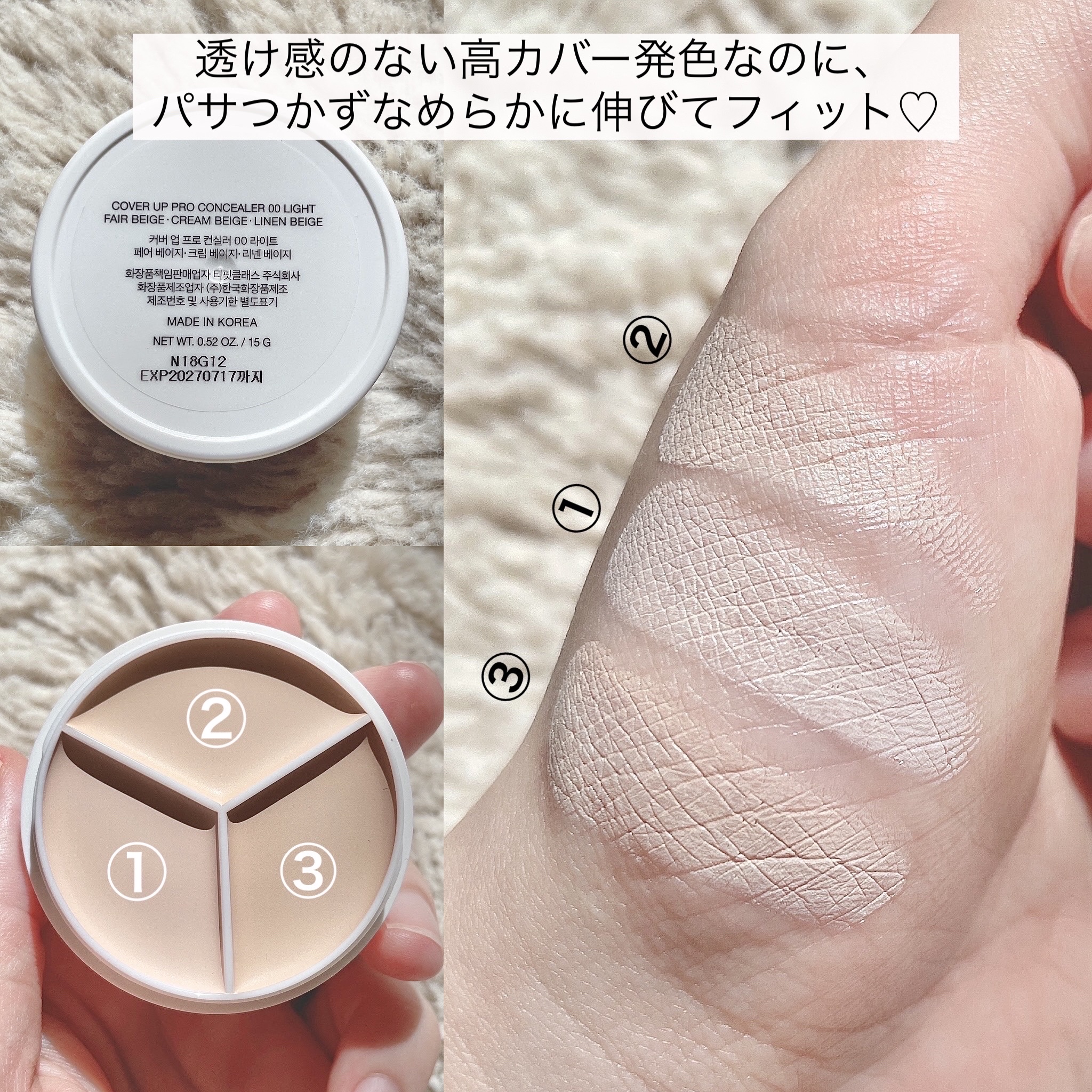 - クマからニキビ跡、シミまでこれ1つでカバー。 3色タイプだからこそ、気になるところや肌色を選ばずにご使用いただけます。 リキッドタイプを圧縮した高濃度バームのため高カバー高密着*¹を実現。 コンシーラーだけでなくコントアとしても使用可能です。 *1メーカー比