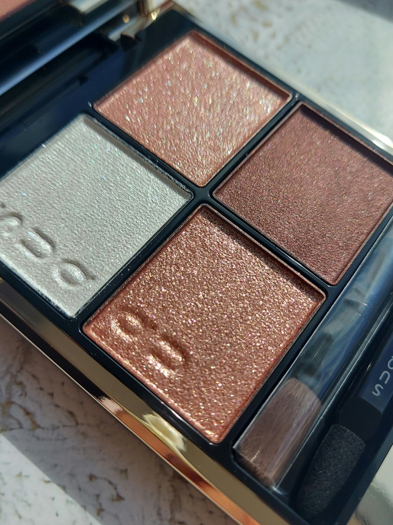 パレット3色はキラキラのラメ✨ 締め色はマット 意外と色づきはシアーなので色よりラメやツヤを楽しむパレット 買ってから毎日使うほどにお気に入りのパレットになりました😊 使いやすいピンクブラウンパレット 素敵なパレットなので定番になったらいいなぁ♡