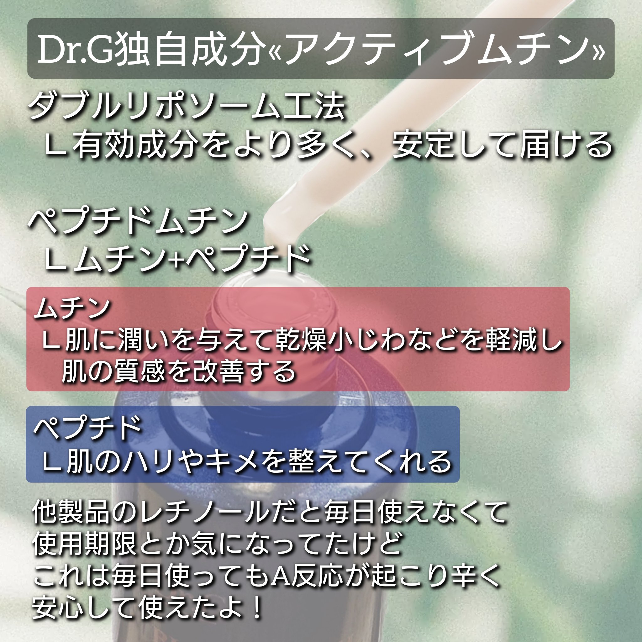 - ブラックスネイル*とレチノール*を配合した、若々しい肌印象に導く美容液です。 Dr.Gのレチノールは独自の成分である、ブラックスネイルレチノール*を使っています! 肌に高い保湿感を与え、肌のキメを整え、弾力やハリのケアを助けるだけでなく、肌の乾燥くすみをケアし、明るい印象のぷるんっとハリのある肌に導きます。 *整肌成分