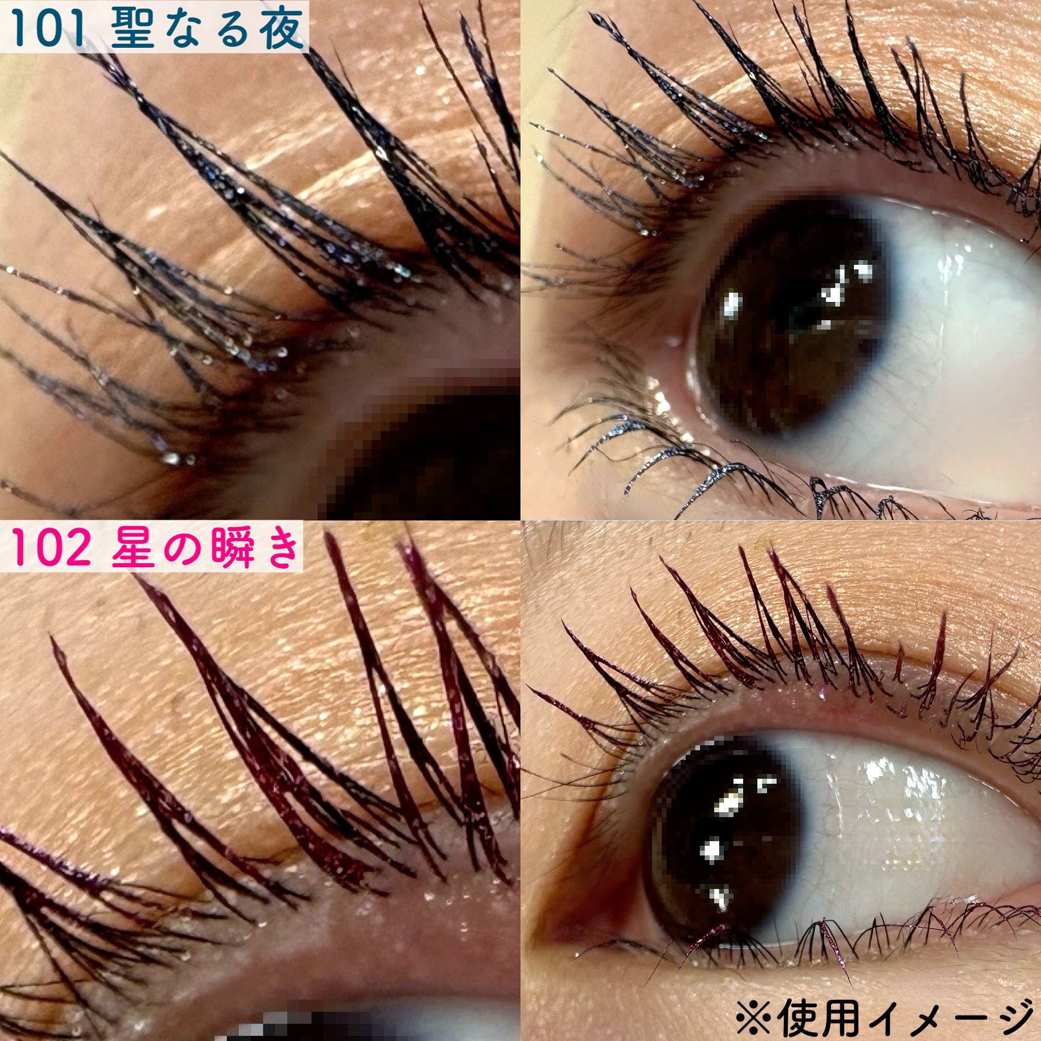 星屑をとじこめたようにきらきらと輝くグリッターで華やかな美まつ毛に 101聖なる夜は、ベースは、メタリックブルーに、シルバーラメパール感強め 数量限定なので、見かけた方はお早めに。